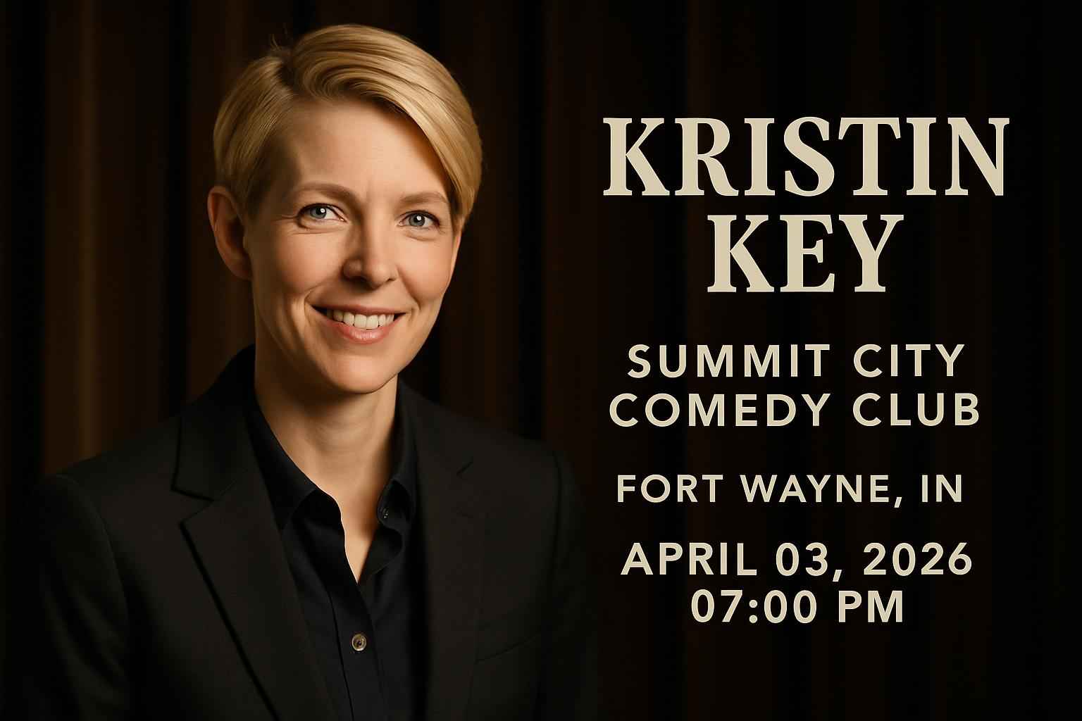 Kristin Key takes the stage at Summit City Comedy Club on April 03 2026 at 700 PM. Early arrival is recommended for the best seating options.