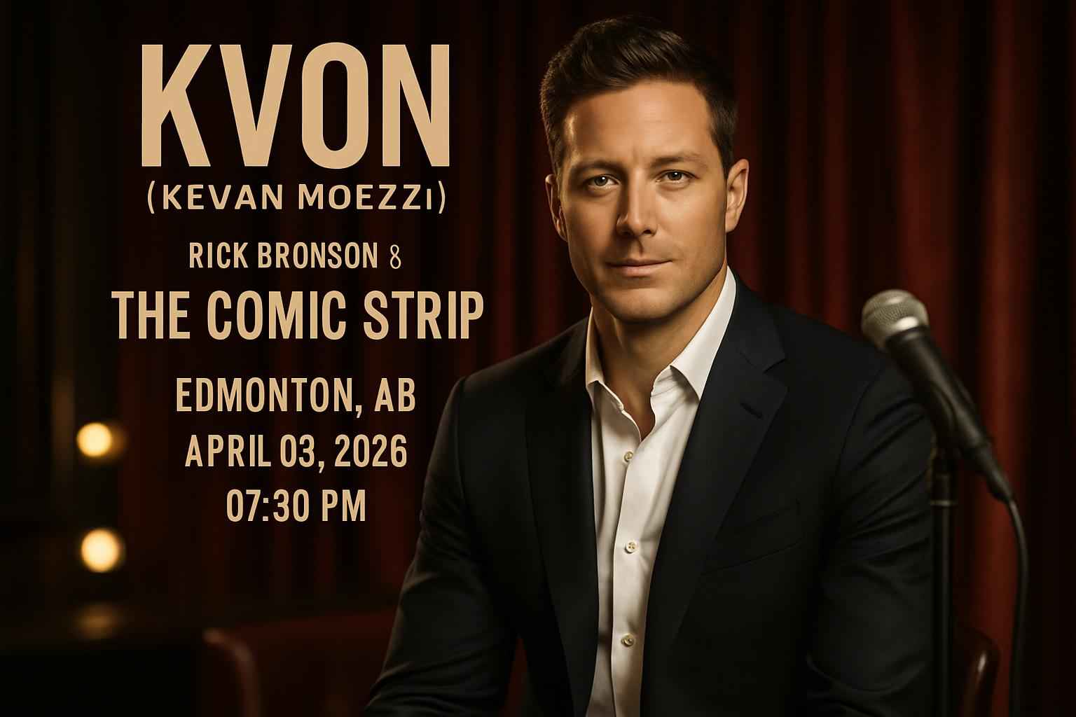 Experience an unforgettable night of stand-up comedy with KVON Kevan Moezzi at Rick Bronsons The Comic Strip in Edmonton AB on April 03 2026 at 0730 PM Discover exclusive coupon codes and promo offers for this top-rated comedy event through RSVP Event Agency Secure your seat at one of Edmontons most highly anticipated comedy performances and save with verified discounts only available here