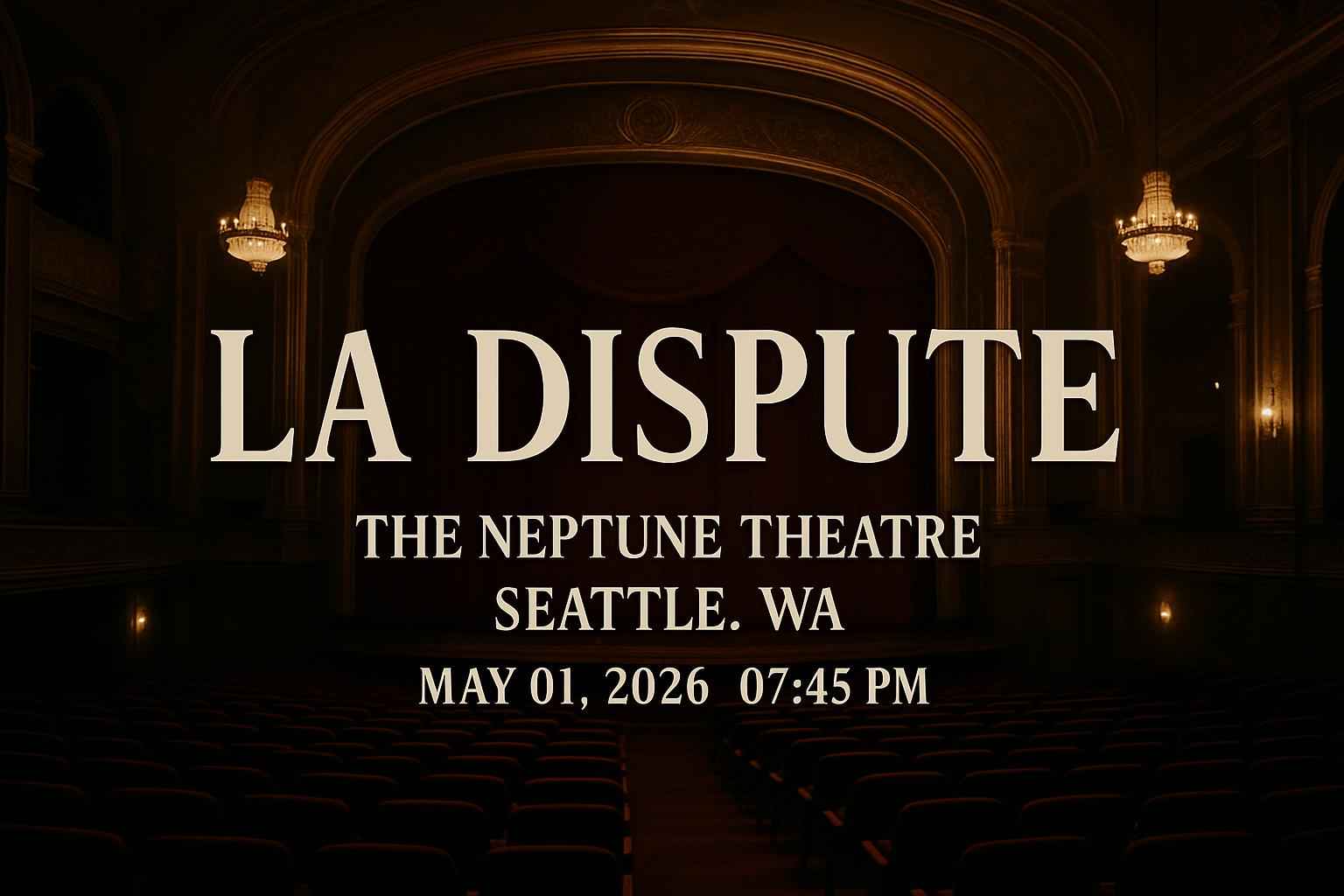Experience LA Dispute live at The Neptune Theatre in Seattle WA on May 01 2026 at 0745 PM. Secure exclusive access to top LA Dispute The Neptune Theatre Seattle tickets and verified coupon codes from RSVP Event Agency. Enjoy significant discounts and real-time promotional deals for this anticipated indie rock concert. Join fans across Seattle for an unforgettable night at one of the citys iconic live music venues.