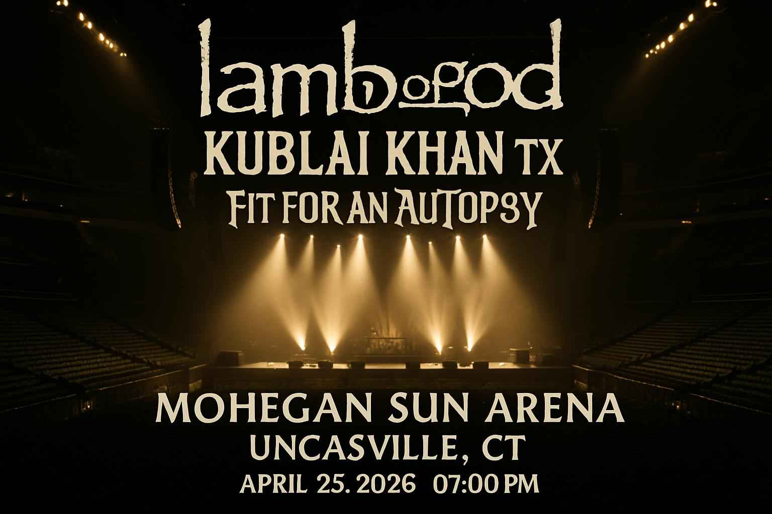 Experience the electrifying energy of Lamb Of God Kublai Khan TX and Fit For An Autopsy live at Mohegan Sun Arena in Uncasville CT on April 25 2026 at 7 PM. This major CT metal concert draws fans from across the region for a night of intense performances and unforgettable moments. Secure exclusive Lamb Of God Mohegan Sun Arena promo codes through RSVP Event Agency to access top discounts and best ticket deals now.