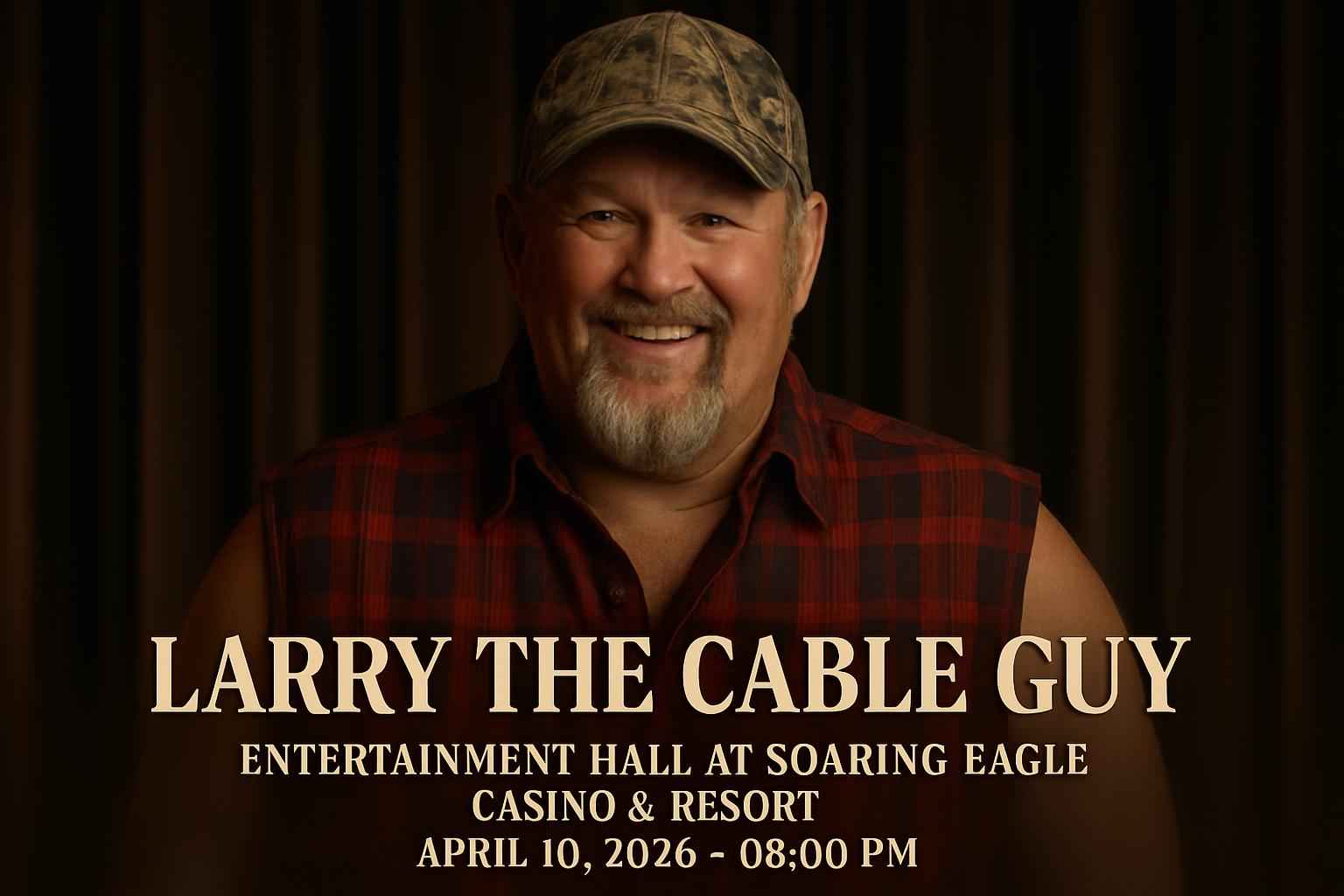 Larry the Cable Guy brings his signature humor and live performance to Mount Pleasant for one night only at the Entertainment Hall at Soaring Eagle Casino & Resort. Doors open at 7:00 PM with the show starting at 8:00 PM. This comedy event attracts fans from across Michigan seeking a memorable night of laughter. The venue features premium seating options and modern amenities for an enhanced guest experience near local dining and lodging.