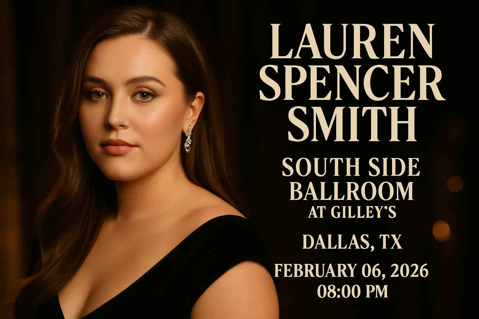 Discover Lauren Spencer Smith live at South Side Ballroom at Gilleys in Dallas TX on February 06 2026 at 8 PM Experience an unforgettable night with chart-topping hits and powerful vocals from one of pop musics fastest rising stars Secure exclusive savings for Lauren Spencer Smith South Side Ballroom tickets with RSVP Event Agency where the best promo codes are always available for Dallas concert fans