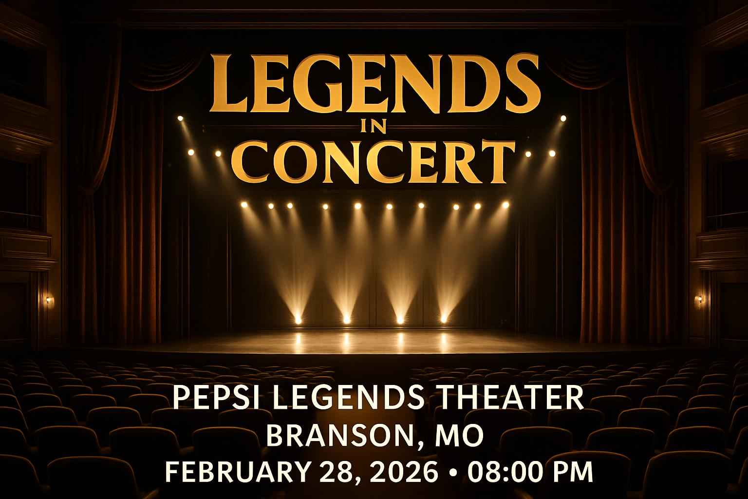 Experience Legends in Concert at Pepsi Legends Theater in Branson on February 28, 2026, at 8 PM. Enjoy world-class tribute performances and exclusive discounts via RSVP Event Agency. Secure discounted tickets, VIP upgrades, and premium seating with verified promo codes. The family-friendly show offers a memorable night with easy venue access, parking, and nearby dining options.