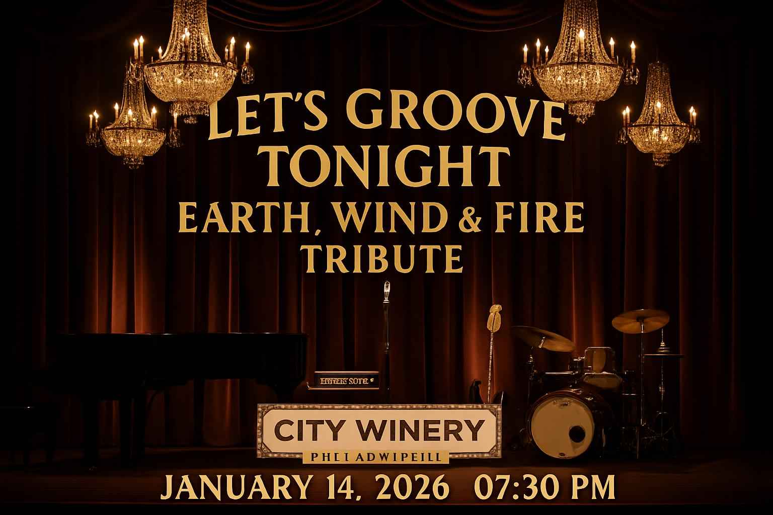 Experience the Lets Groove Tonight Earth Wind and Fire Tribute live at City Winery Philadelphia on January 14, 2026, 7:30 PM. Enjoy authentic performances of classic hits with vibrant energy. Secure tickets with exclusive RSVP Event Agency promo codes for discounts, group deals, and last-minute offers. City Winery offers premium acoustics, local dining, and accessible facilities for an unforgettable concert night.