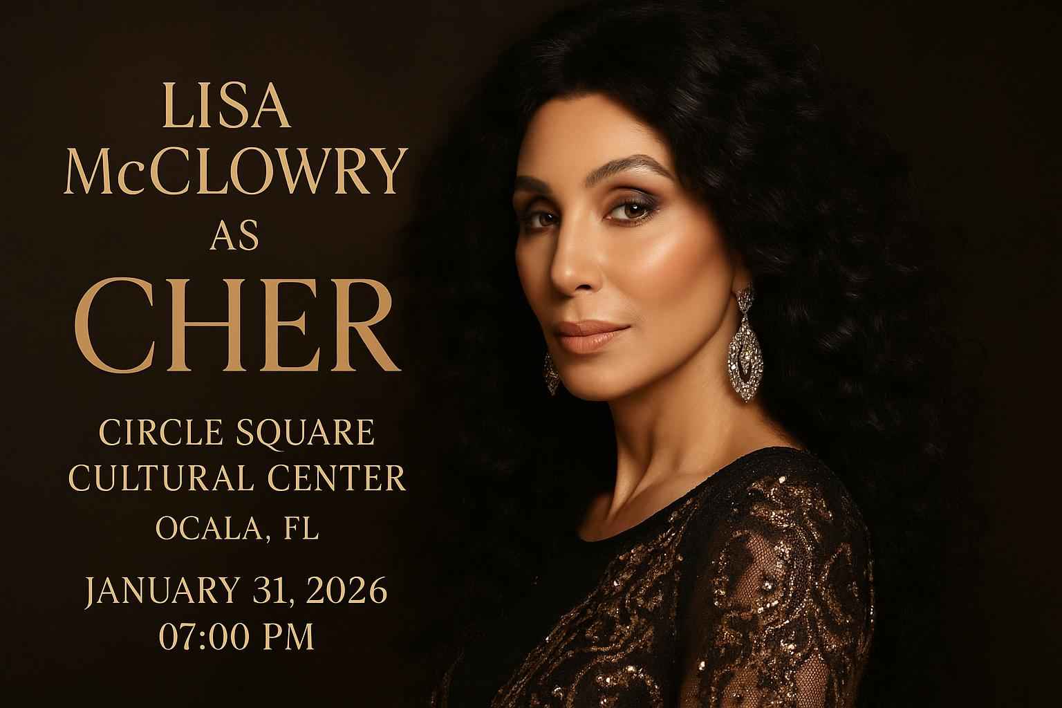 The Lisa Mcclowry As Cher show begins at 7 PM on January 31 2026 at Circle Square Cultural Center in Ocala FL.