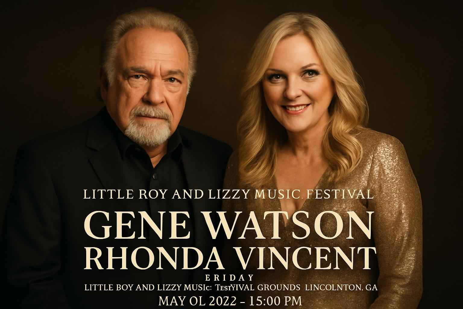 The Friday event featuring Gene Watson and Rhonda Vincent begins at 12:00 PM on May 01 2026 at the Little Roy and Lizzy Music Festival Grounds in Lincolnton GA.