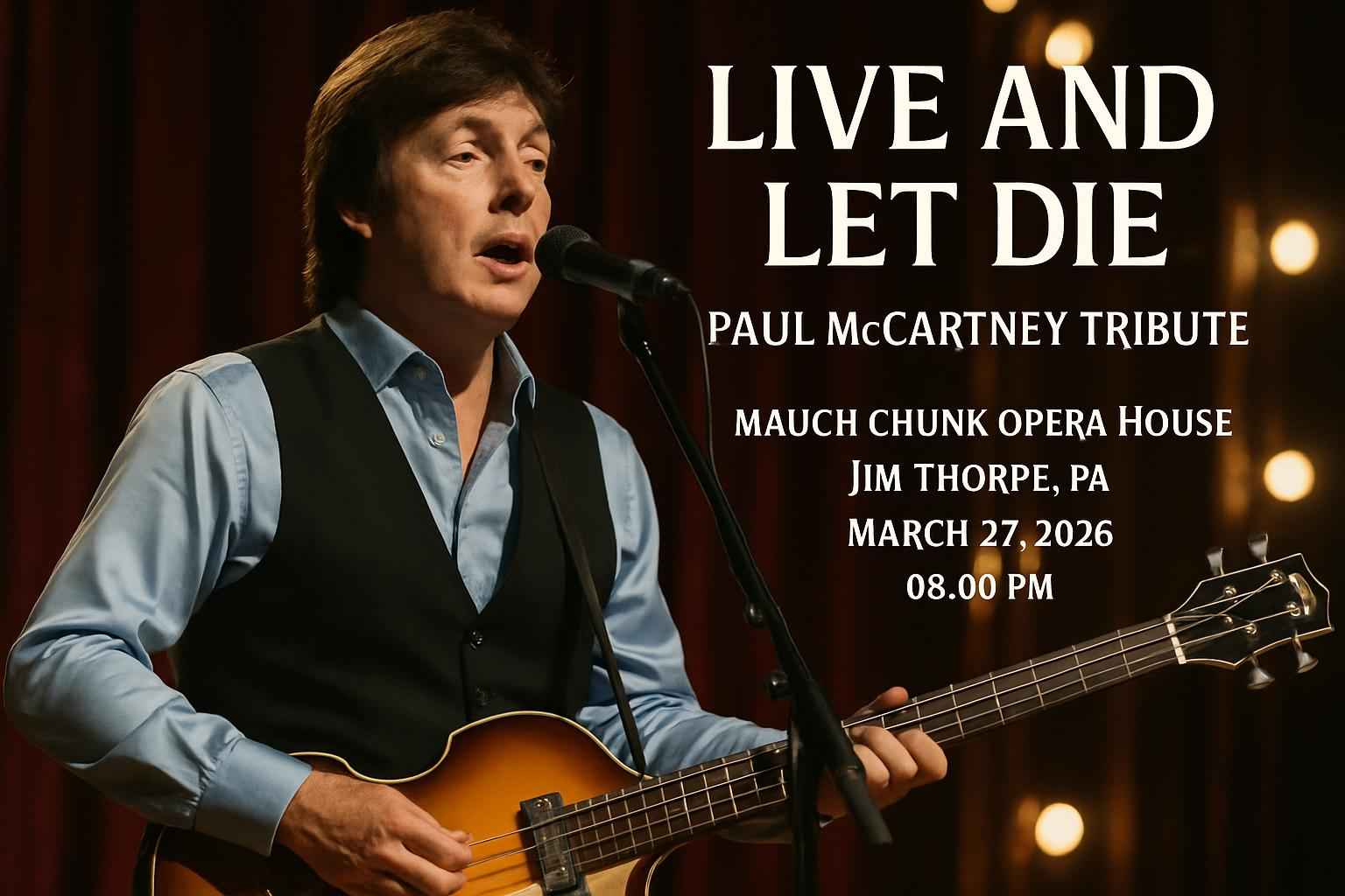 Experience the unforgettable Live And Let Die – Paul McCartney Tribute at Mauch Chunk Opera House in Jim Thorpe PA on March 27 2026 at 8:00PM. This celebrated tribute show delivers a high-energy performance of McCartneys greatest hits faithfully recreated by world-class musicians. Secure exclusive access to the most sought-after coupon codes for Live And Let Die at RSVP Event Agency and enjoy premium savings on tickets for this anticipated event.