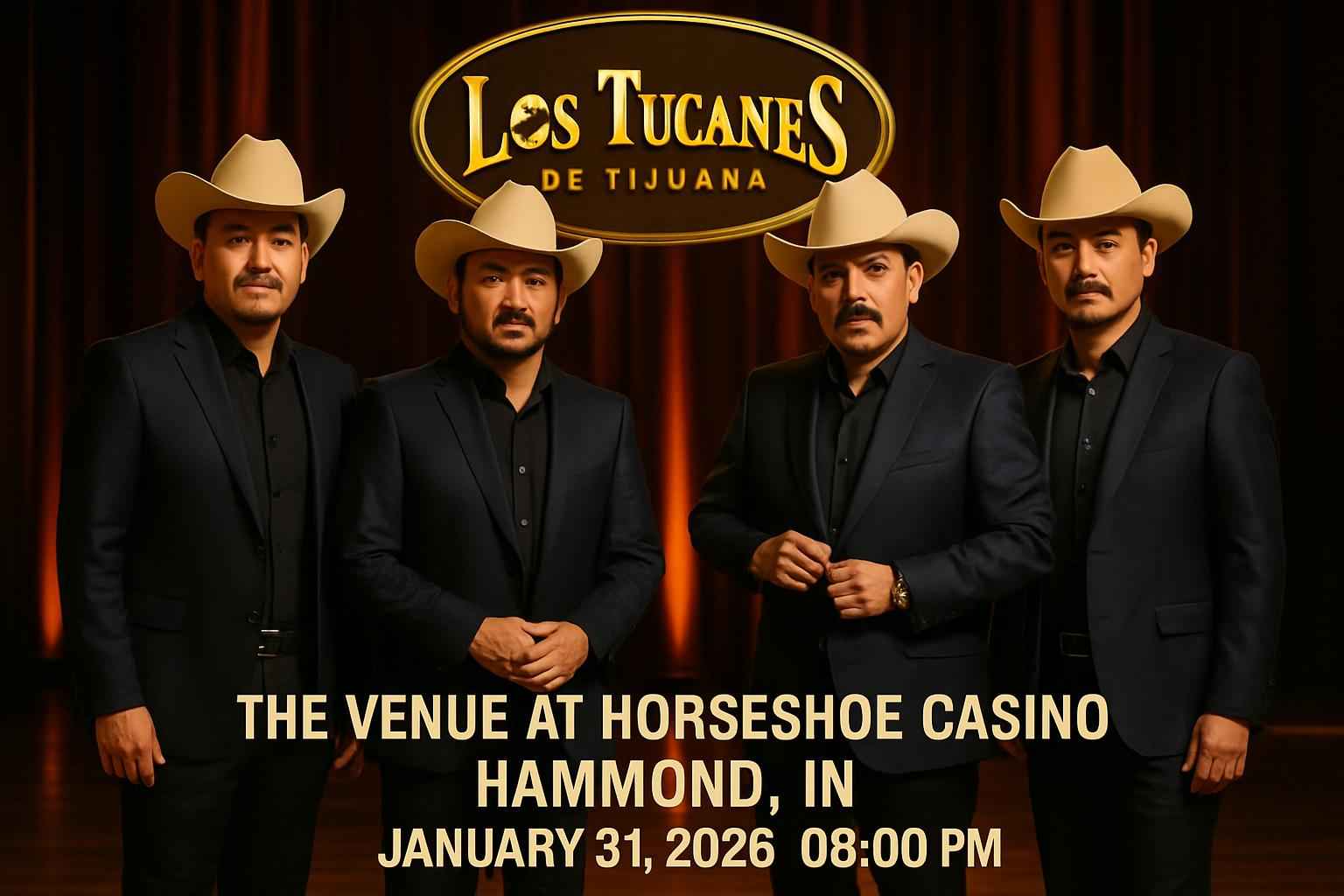 Experience the electrifying sounds of Los Tucanes De Tijuana live at The Venue at Horseshoe Casino in Hammond IN on January 31 2026 at 8 PM. Secure top promo codes for this highly anticipated regional Mexican music concert exclusively at RSVP Event Agency. Hammond locals and travelers can unlock the best ticket deals and exclusive discounts for an unforgettable night with chart-topping hits and energetic performances.