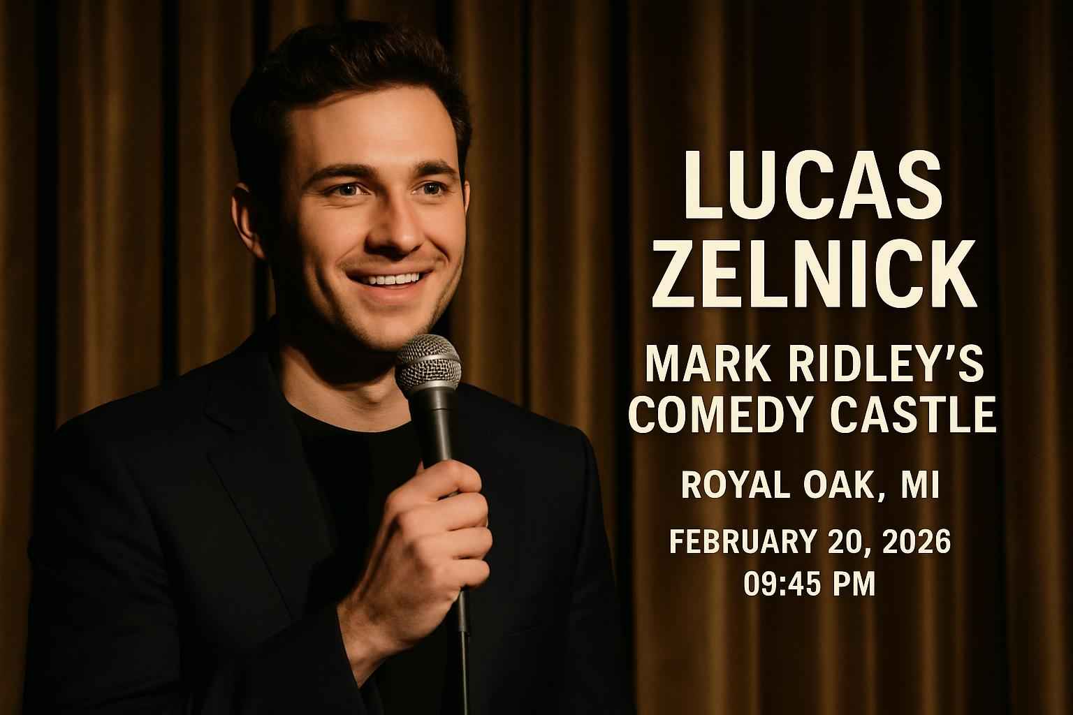 Experience unfiltered stand-up with Lucas Zelnick at Mark Ridleys Comedy Castle in Royal Oak MI on February 20 2026 at 0715 PM. This event is drawing attention across Metro Detroit for its sharp wit and modern humor. Secure your seat at one of Michigans most iconic comedy venues and discover why Lucas Zelnick is a rising star in live comedy. RSVP Event Agency provides exclusive Lucas Zelnick Mark Ridleys Comedy Castle promo codes and ticket discounts designed for comedy fans searching for the best deals online.