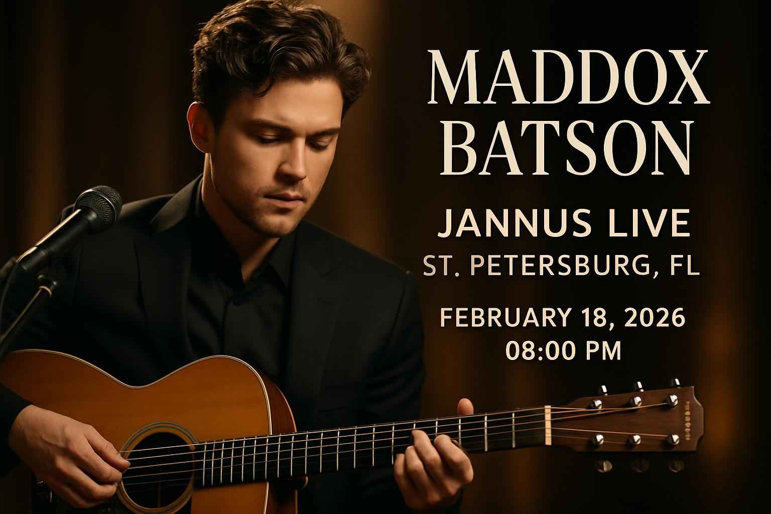 The Maddox Batson concert at Jannus Live starts at 8 PM on February 18 2026. Doors typically open one hour before showtime.