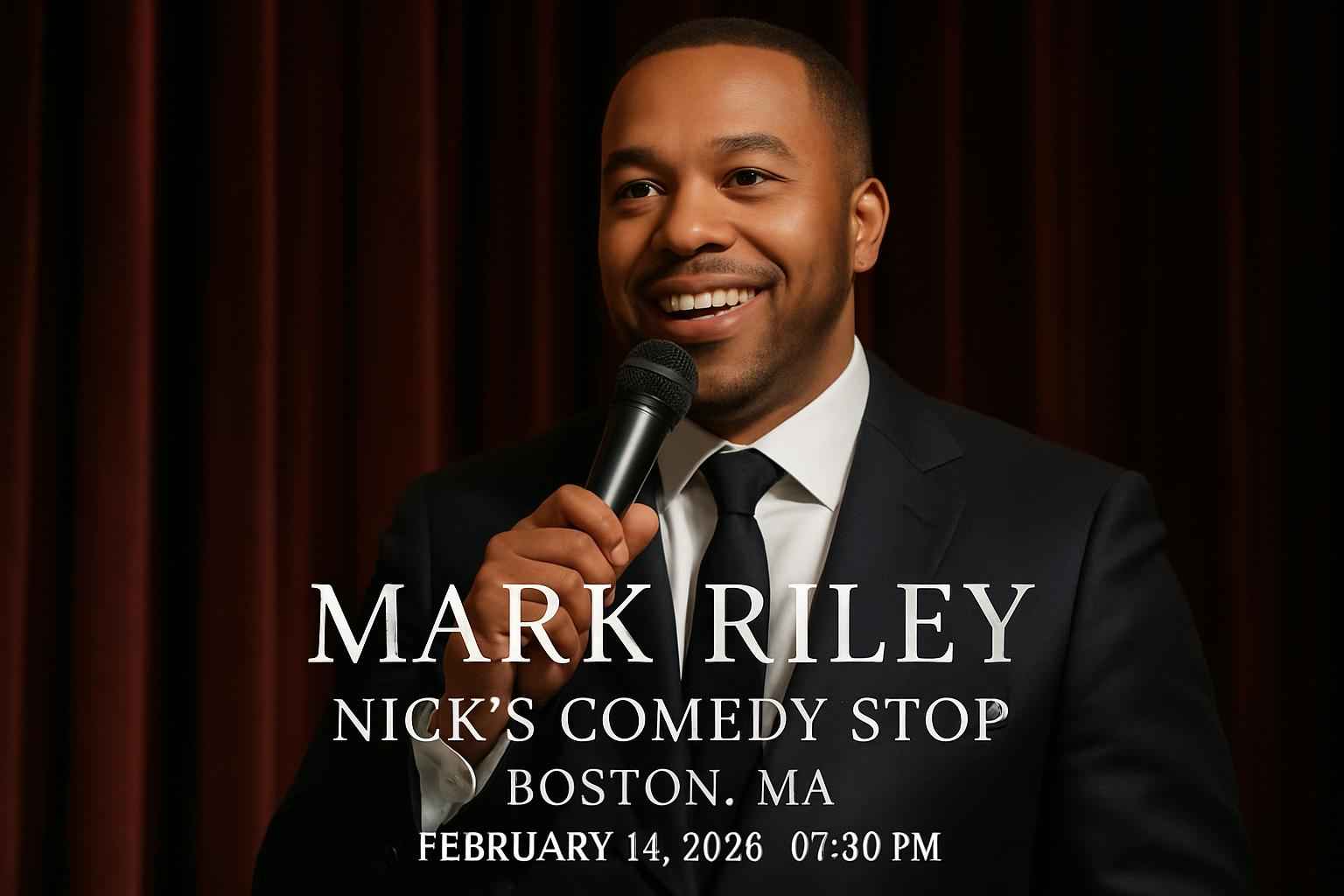 Mark Riley takes the stage at 0730 PM on February 14 2026 at Nick’s Comedy Stop in Boston MA.