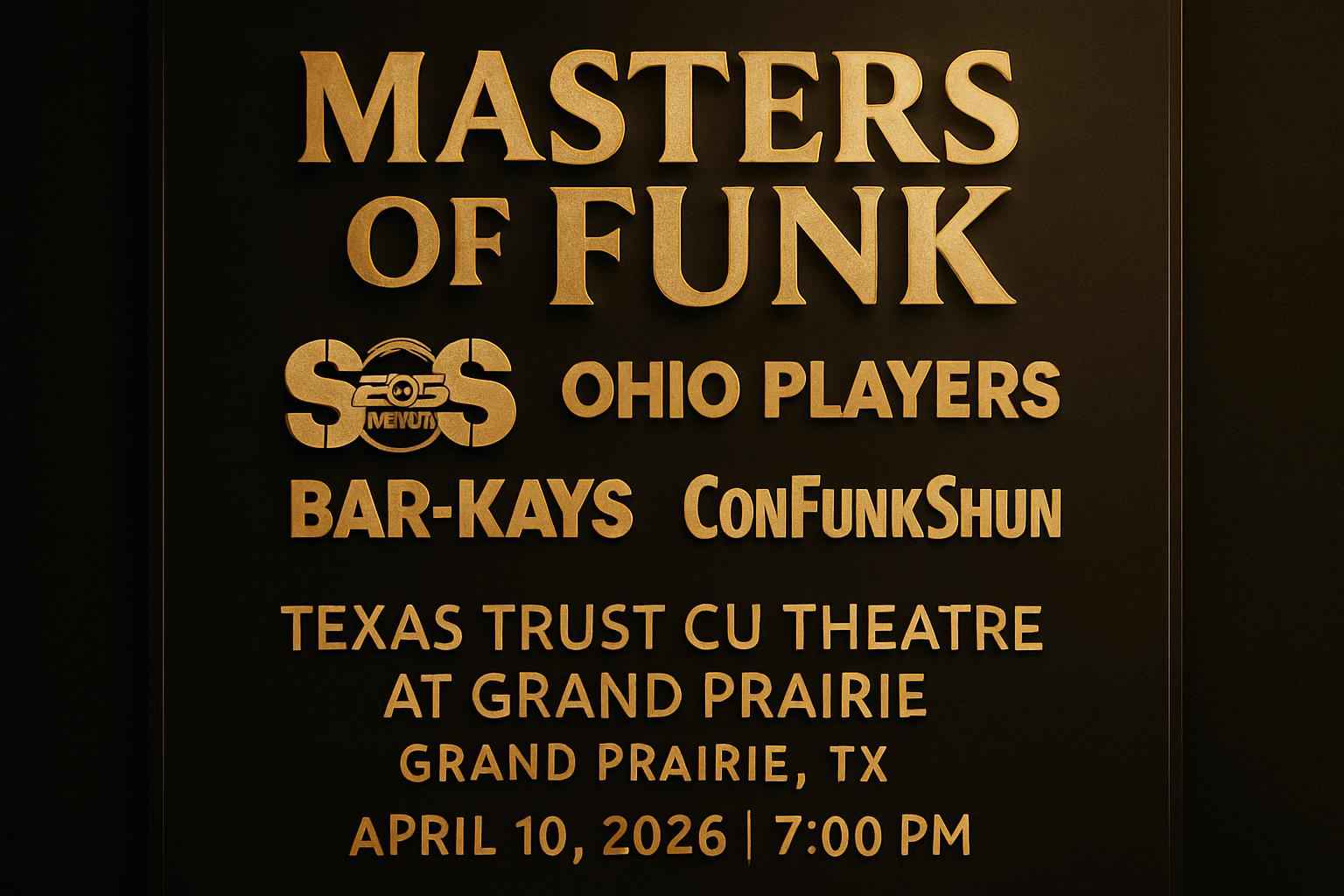 Masters of Funk brings together S O S Band Ohio Players Bar Kays and ConFunkShun for one unforgettable show at Texas Trust CU Theatre Grand Prairie on April 10 2026 starting at 7 PM. The venue is centrally located with easy access from Dallas and Fort Worth. Enjoy legendary funk music in a state-of-the-art setting featuring premium sound and ample parking. Book early with RSVP Event Agency promo codes for the lowest ticket prices.