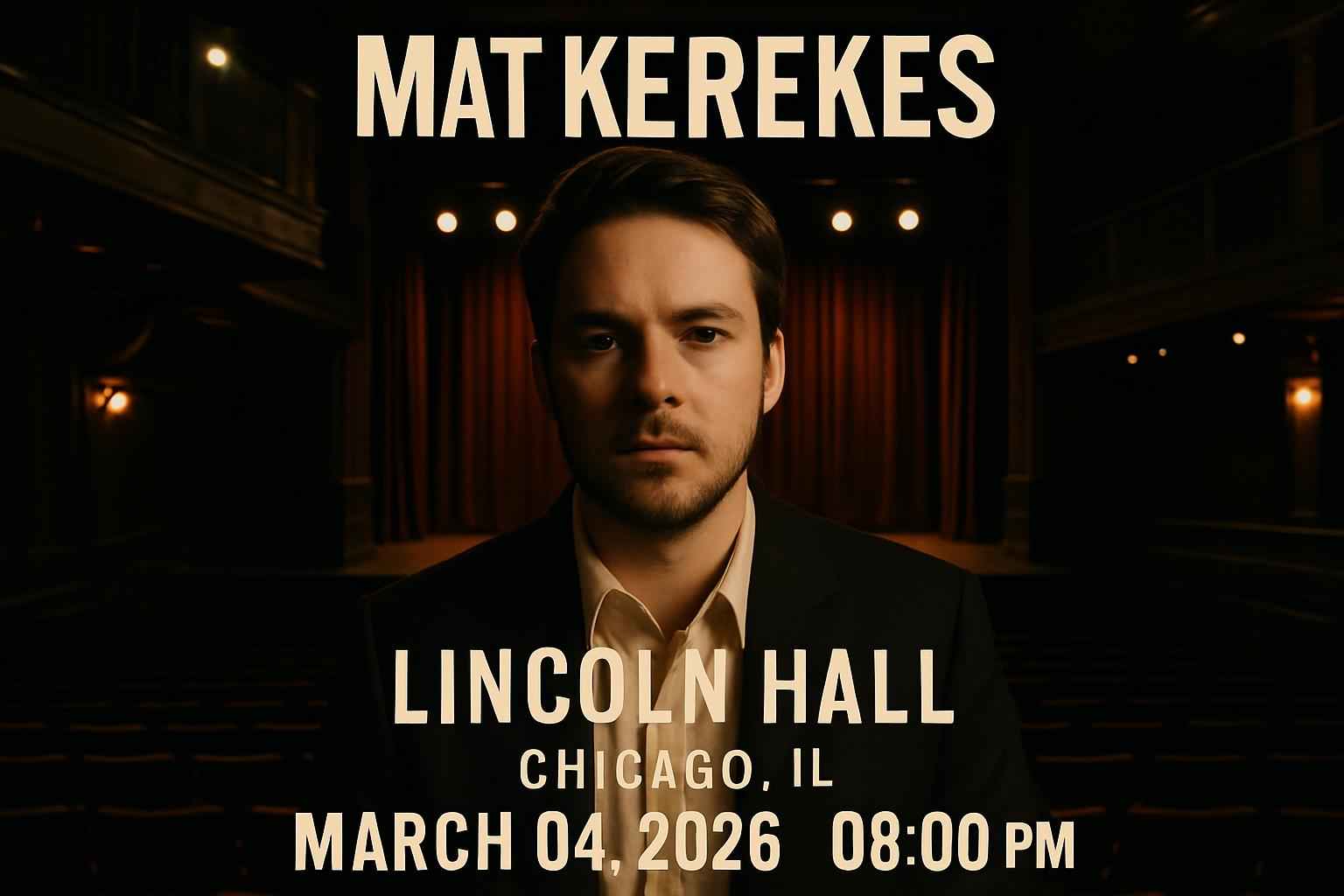 Mat Kerekes will perform at Lincoln Hall 2424 N Lincoln Ave Chicago IL on March 04 2026. Doors open at 7 PM with showtime scheduled for 8 PM. This highly rated indie event features new tracks and fan favorites in a historic venue known for top-tier acoustics and intimate atmosphere. Lincoln Hall is located in the heart of Lincoln Park steps from public transit and local dining.