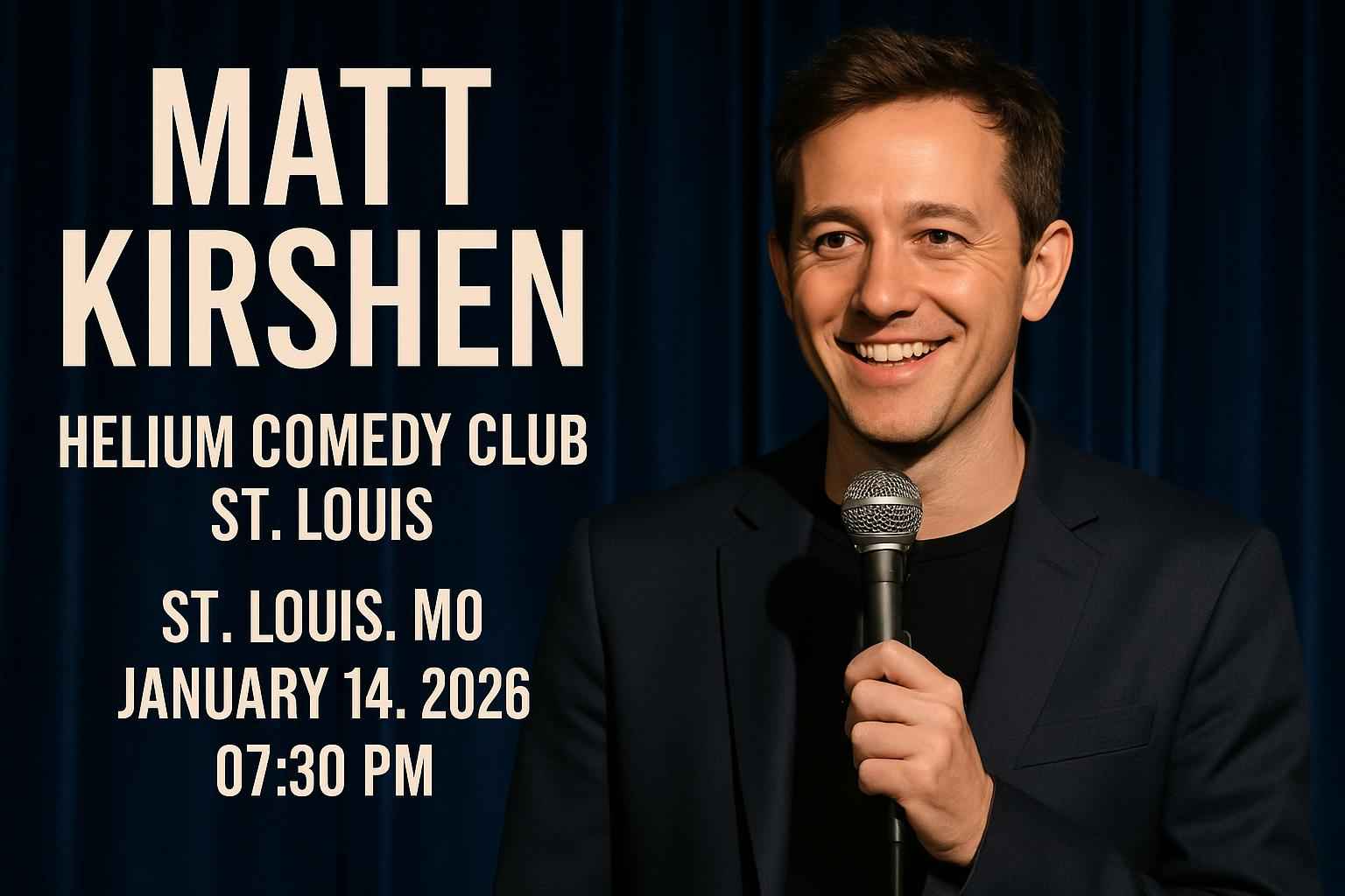 The Matt Kirshen comedy show at Helium Comedy Club St Louis starts at 0730 PM on January 14 2026. Doors typically open at 0700 PM.