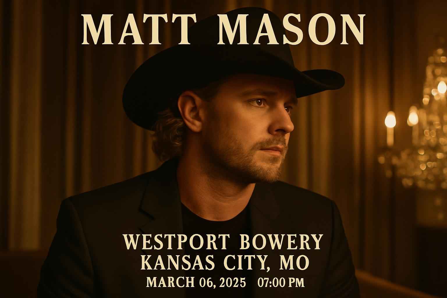 The Matt Mason concert at Westport Bowery kicks off March 06 2026 at 7 PM. This Kansas City music event draws fans from across Missouri and the Midwest looking for live country music in a renowned local venue. Doors open early for VIP access and premium seat selection. Early ticket buyers often gain exclusive perks and better seat choices so reserve your spot as soon as possible.