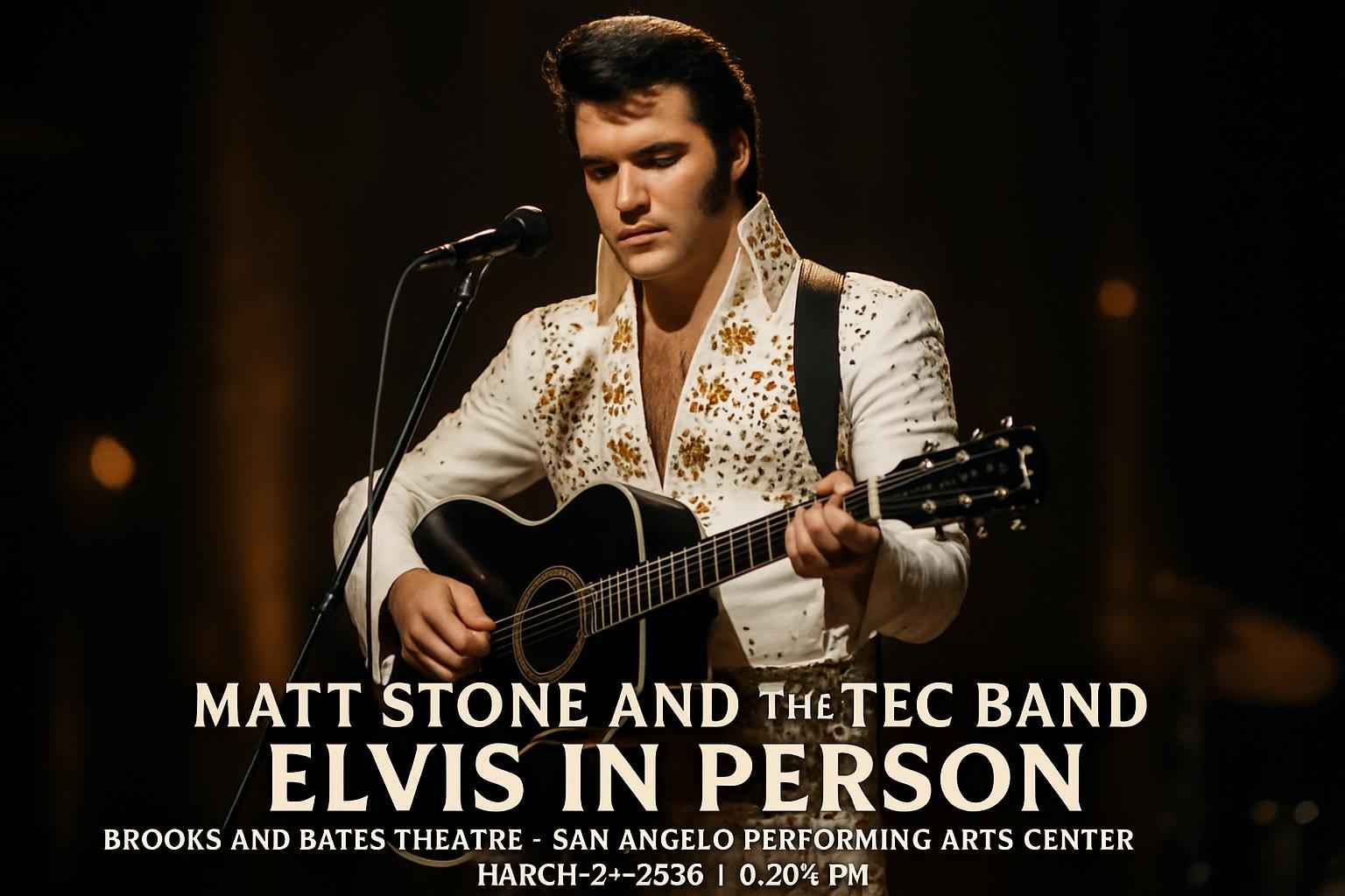 Matt Stone and the TEC Band bring the electrifying Elvis in Person show to Brooks and Bates Theatre at San Angelo Performing Arts Center in San Angelo TX on March 27 2026 at 7 PM. This live tribute concert delivers the timeless sound and style of Elvis Presley with unmatched authenticity. Fans and families searching for exclusive coupon codes for Matt Stone and the TEC Band Elvis in Person at Brooks and Bates Theatre can access the lowest prices and premium seating through RSVP Event Agency. Secure your promo code for instant savings today.