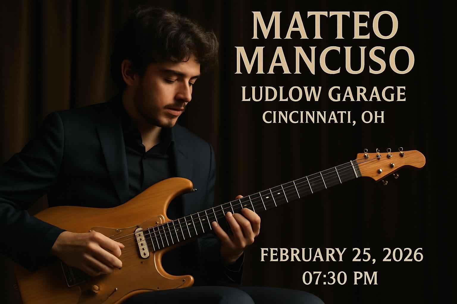 Matteo Mancuso brings his world-class guitar talent to the iconic Ludlow Garage located at 342 Ludlow Avenue Cincinnati OH. Doors open at 630 PM with the concert beginning at 730 PM. This venue is known for its intimate acoustics and welcoming atmosphere making it the ideal place to hear Matteo Mancuso perform live. Secure your seats today and be part of a unique musical experience in Cincinnati.