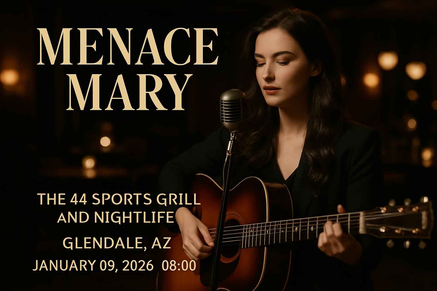 The Menace Mary event begins at 8 PM on January 09 2026 at The 44 Sports Grill and Nightlife in Glendale AZ.