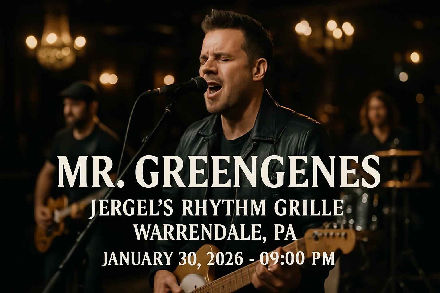 The Mr Greengenes concert begins at 900 PM on January 30 2026 at Jergel’s Rhythm Grille in Warrendale PA.