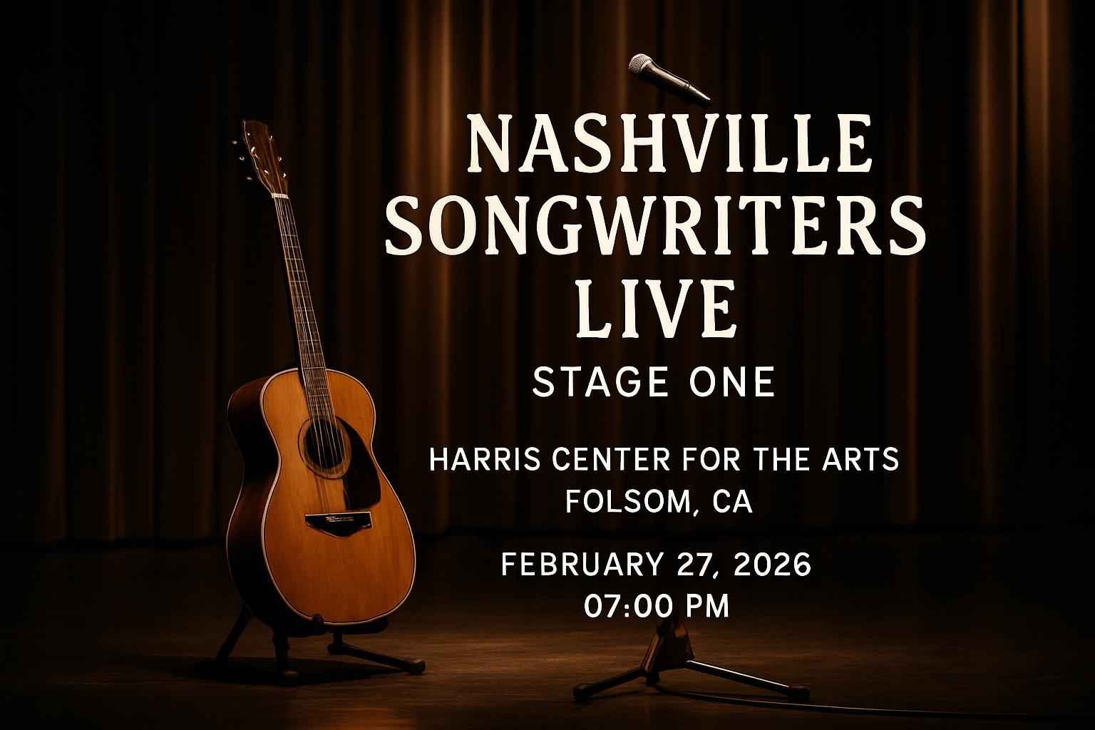 Experience an unforgettable evening of music at Nashville Songwriters Live – Stage One at Harris Center for the Arts in Folsom CA on February 27 2026 at 07:00 PM. This exclusive event brings top Nashville songwriters to the heart of Folsom for a unique live concert blending storytelling acoustic performances and chart-topping hits. Secure your tickets today and enjoy verified RSVP Event Agency promo codes for instant savings on every seat.