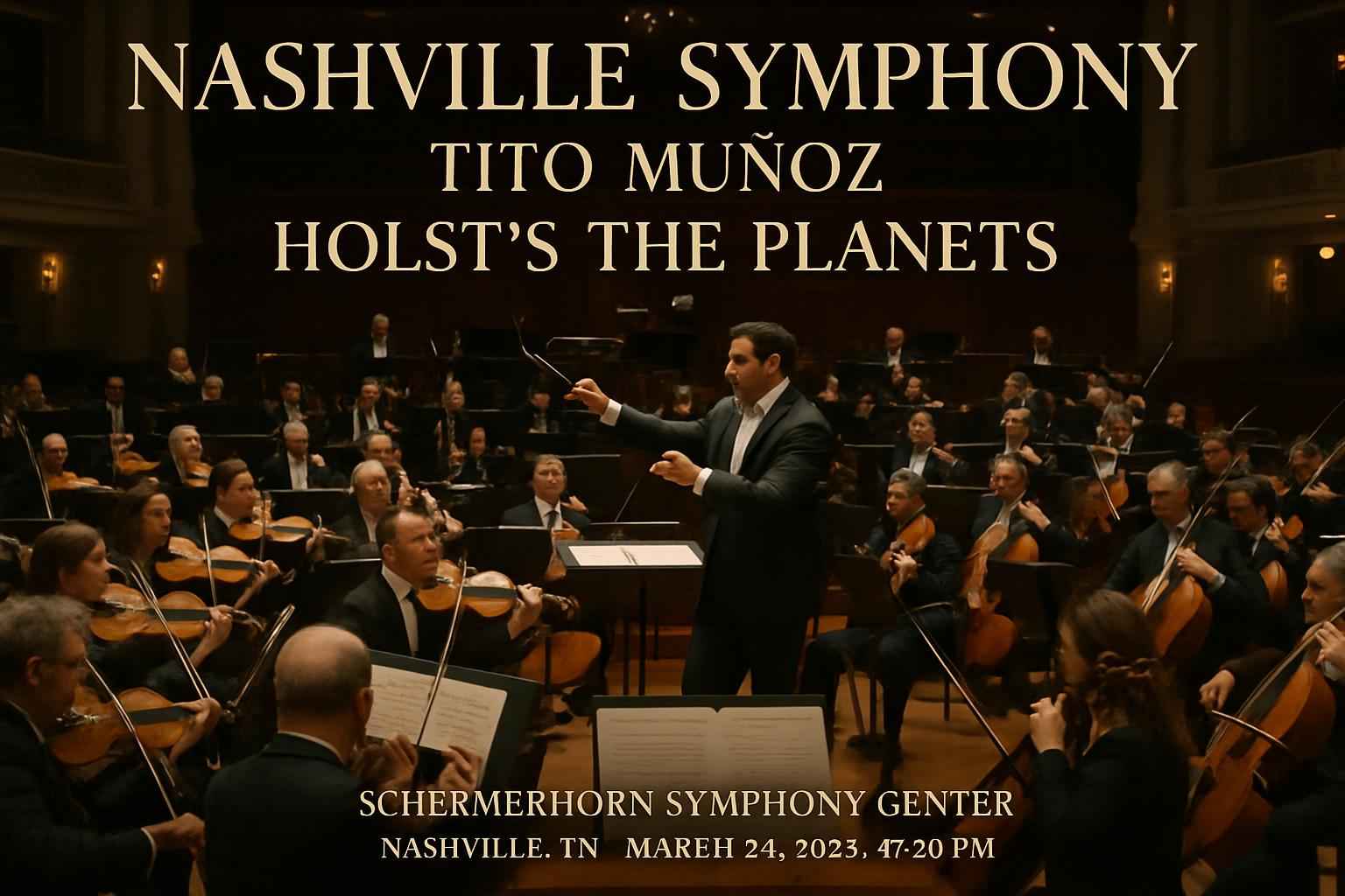 Experience Nashville Symphony Tito Munoz Holst’s The Planets at Schermerhorn Symphony Center in downtown Nashville TN on March 28 2026 at 730 PM. This highly anticipated event brings together acclaimed conductor Tito Munoz and the world-class Nashville Symphony for a breathtaking performance of Holst’s iconic work The Planets. Secure exclusive promo codes and Nashville Symphony discount tickets on RSVP Event Agency for the best seats and savings.