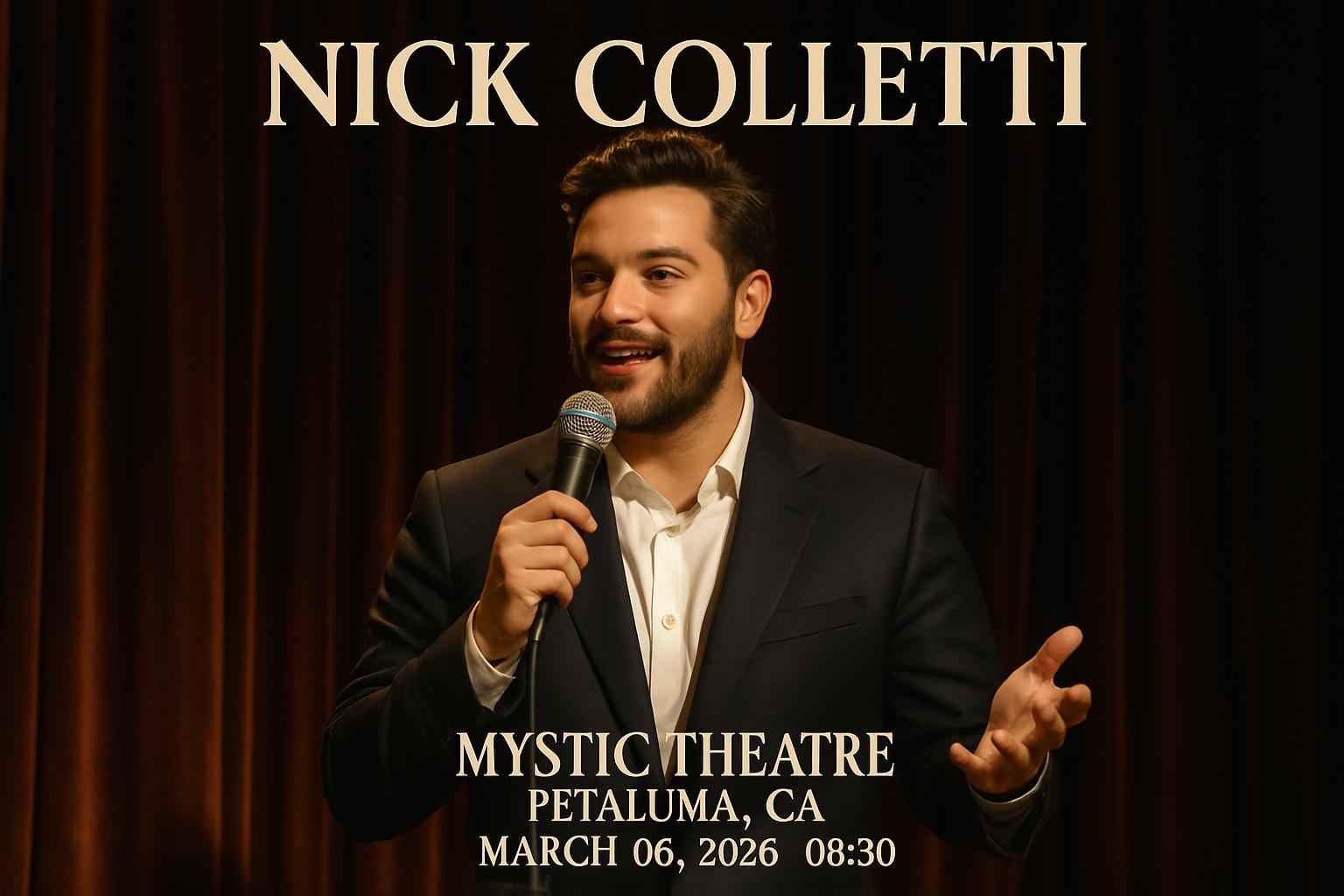 Experience top-tier comedy live in Petaluma with Nick Colletti at Mystic Theatre on March 06 2026 at 0830 PM. Secure your seat at this highly anticipated stand-up event featuring viral humor and unforgettable performances. Unlock exclusive savings with RSVP Event Agency promo codes and discount tickets for Nick Colletti Mystic Theatre. Maximize your entertainment budget and enjoy premium event access at the heart of Sonoma County.