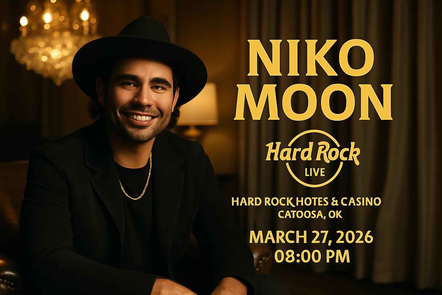 Niko Moon takes the stage at 8 PM on March 27 2026 with doors opening at 7 PM at Hard Rock Hotel & Casino Tulsa.