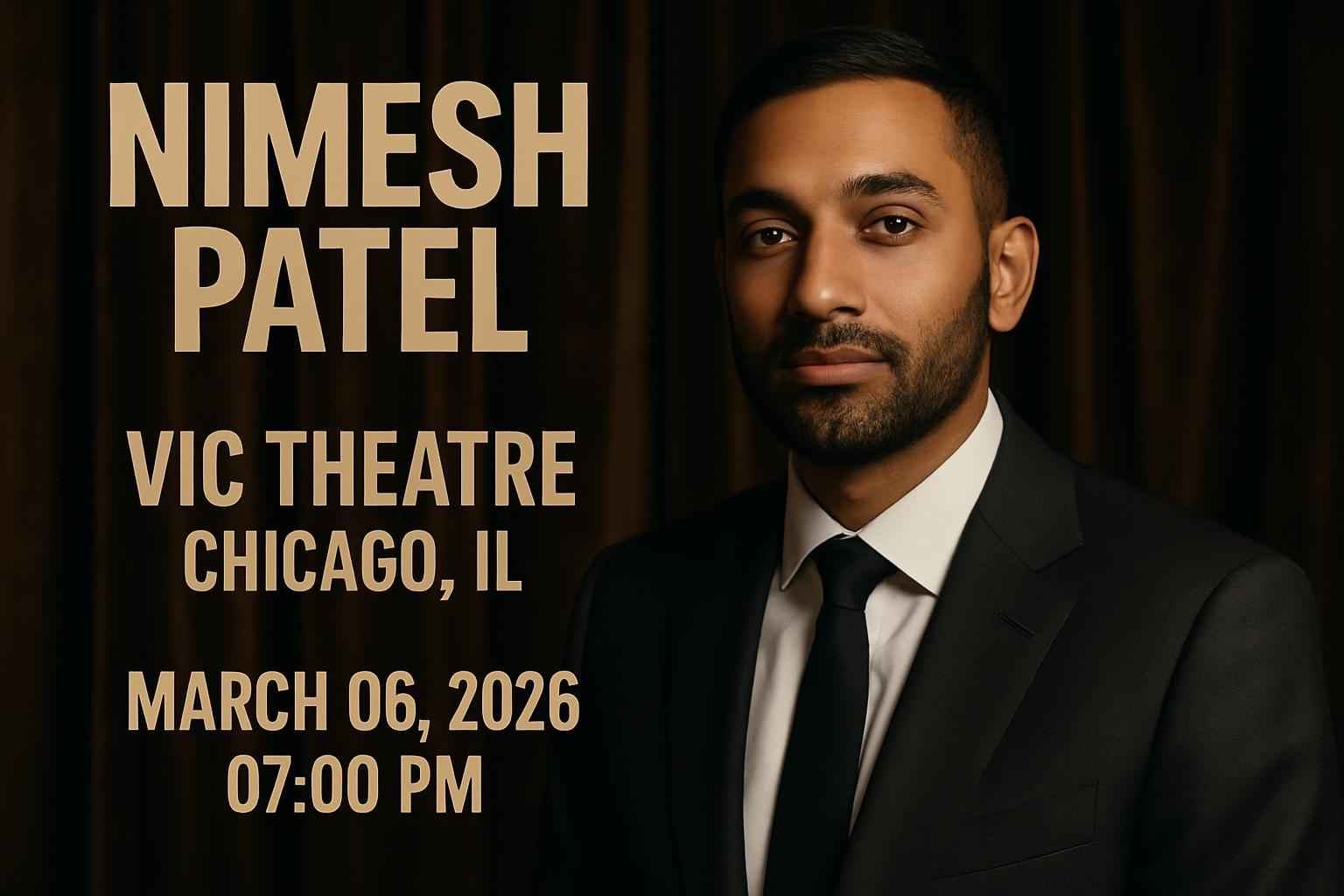 Discount tickets for Nimesh Patel in Chicago are available on RSVP Event Agency with verified promo codes and special offers for the Vic Theatre show.