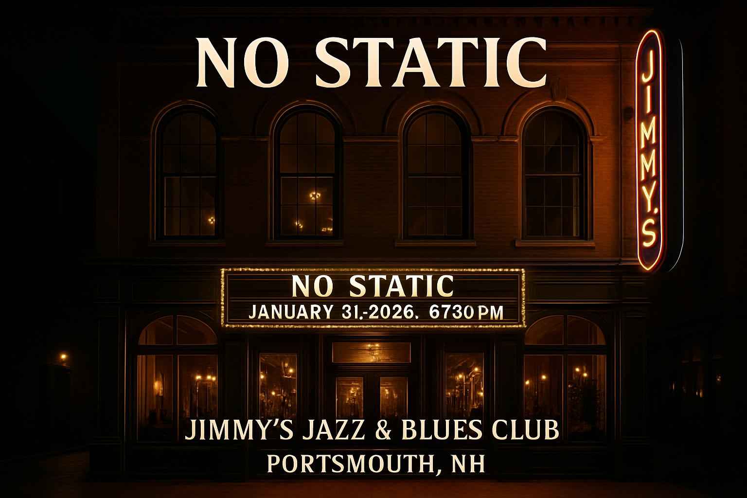 TLDR: Experience No Static's jazz and blues live at Jimmy's Jazz & Blues Club in Portsmouth, NH on January 31, 2026, at 7:30 PM. Enjoy gourmet dining, craft cocktails, and intimate acoustics. Get exclusive promo codes and discounts via RSVP Event Agency. Convenient parking and nearby accommodations available. Doors open at 6 PM; smart casual dress recommended.