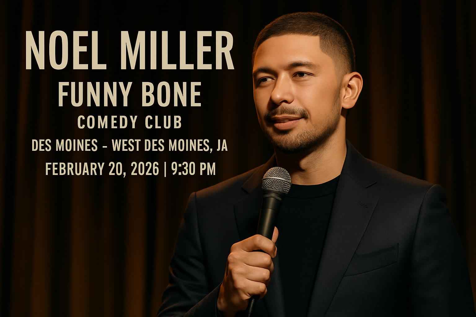 TLDR: Experience Noel Miller’s high-energy stand-up at Funny Bone Comedy Club in West Des Moines on February 20, 2026, at 9:30 PM. Get exclusive discount codes and promo offers through RSVP Event Agency for affordable tickets. Enjoy easy parking, local dining, and a memorable comedy night with sharp humor and interactive storytelling.