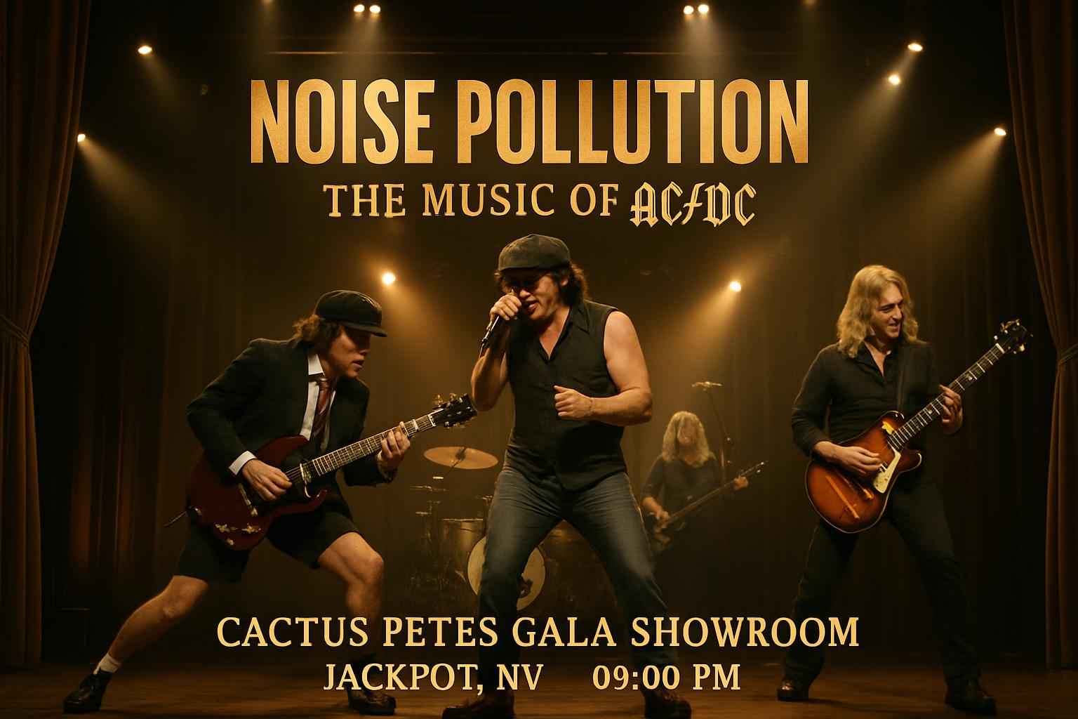 Noise Pollution – The Music of AC/DC begins at 9 PM on April 24 2026 with doors opening at 8 PM at Cactus Petes Gala Showroom in Jackpot NV.