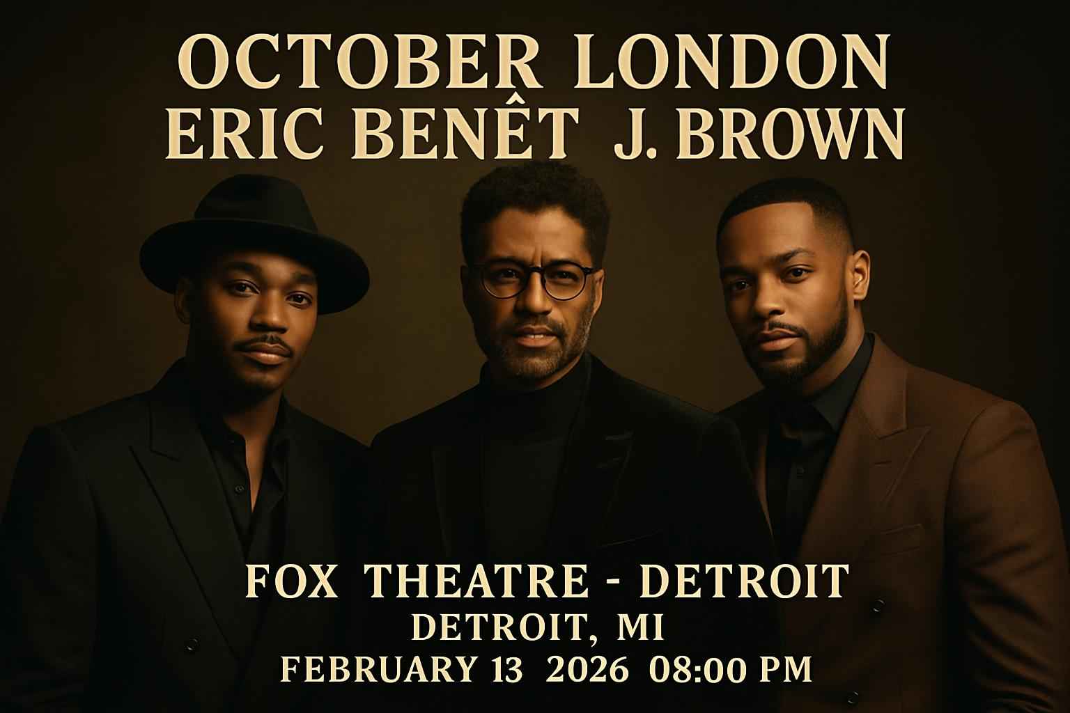 TLDR: On February 13, 2026, October London, Eric Benet, and J Brown perform soulful R&B live at Detroit’s Fox Theatre. Doors open at 7 PM, show starts at 8 PM. Secure tickets with exclusive promo codes and discounts via RSVP Event Agency. Enjoy premium seating, accessible accommodations, nearby parking, and an electric concert atmosphere downtown.