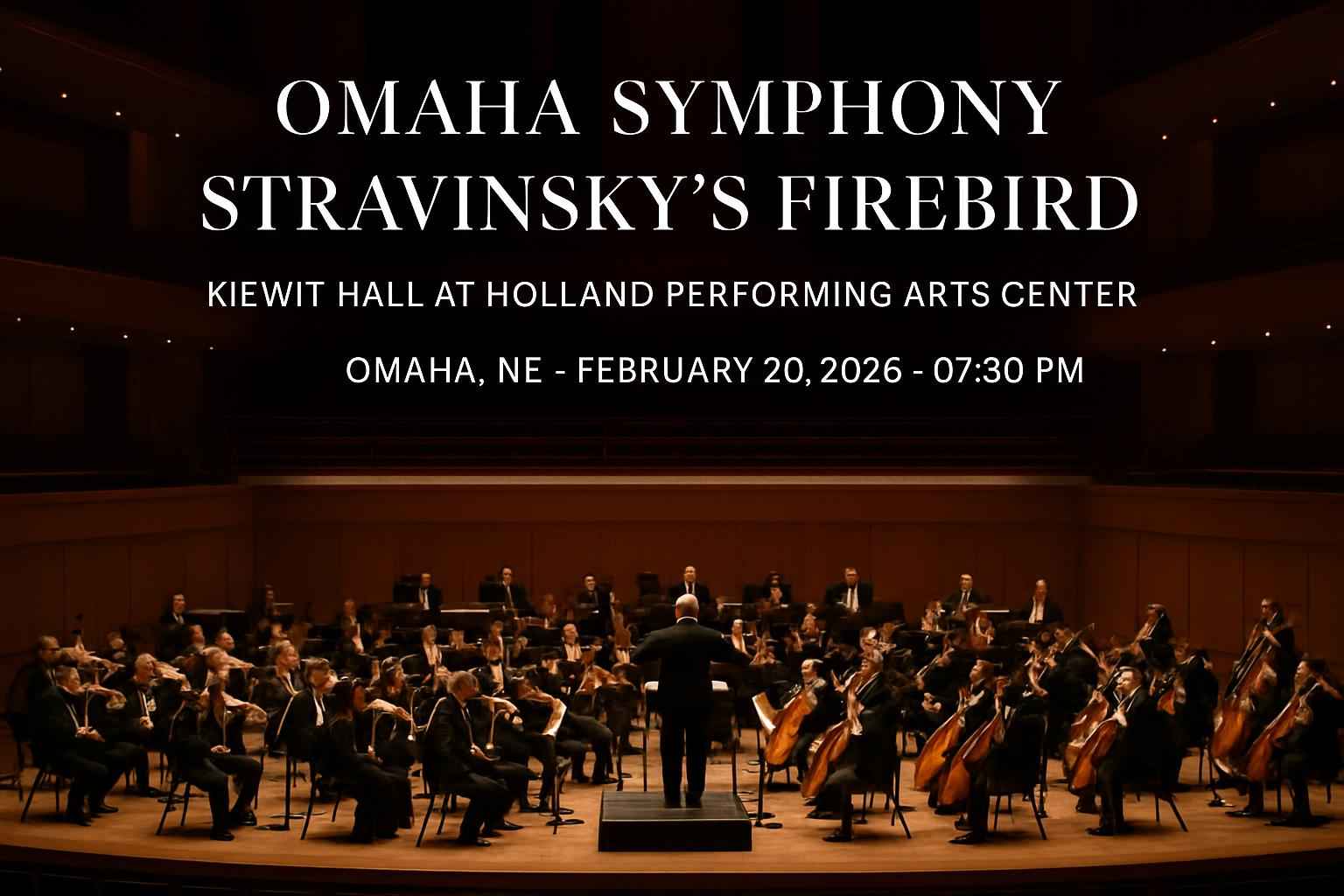 Experience the legendary Omaha Symphony performing Stravinsky’s Firebird live at Kiewit Hall at Holland Performing Arts Center in Omaha NE on February 20 2026 at 7:30 PM. Secure your seat for a night of world-class orchestral music in one of Omaha’s premier venues. Discover exclusive RSVP Event Agency promo codes for Stravinsky’s Firebird and enjoy savings on premium tickets. Join music lovers from Omaha and beyond for this celebrated classical event.