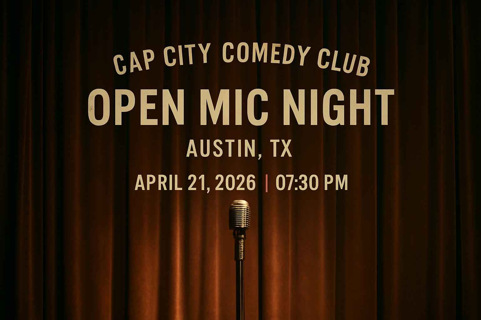 Experience the energy of Austin comedy at Open Mic Night – Cap City Comedy Club on April 21 2026 at 7:30 PM. Enjoy emerging and veteran comedians performing live in the heart of Austin TX. Secure tickets with exclusive Cap City Comedy Club promo codes from RSVP Event Agency for the best event deals. This comedy event is perfect for fans searching for local stand-up shows affordable ticket prices and verified coupon codes for Open Mic Night in Austin.