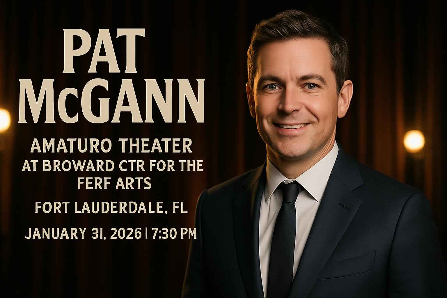 Experience Pat McGann live at Amaturo Theater at Broward Center for the Performing Arts in Fort Lauderdale FL on January 31 2026 at 0730 PM. This top-rated comedy show brings Pat McGanns sharp wit and authentic humor to South Florida for one night. Secure exclusive discounts and the best coupon codes for Pat McGann Amaturo Theater tickets through RSVP Event Agency now.