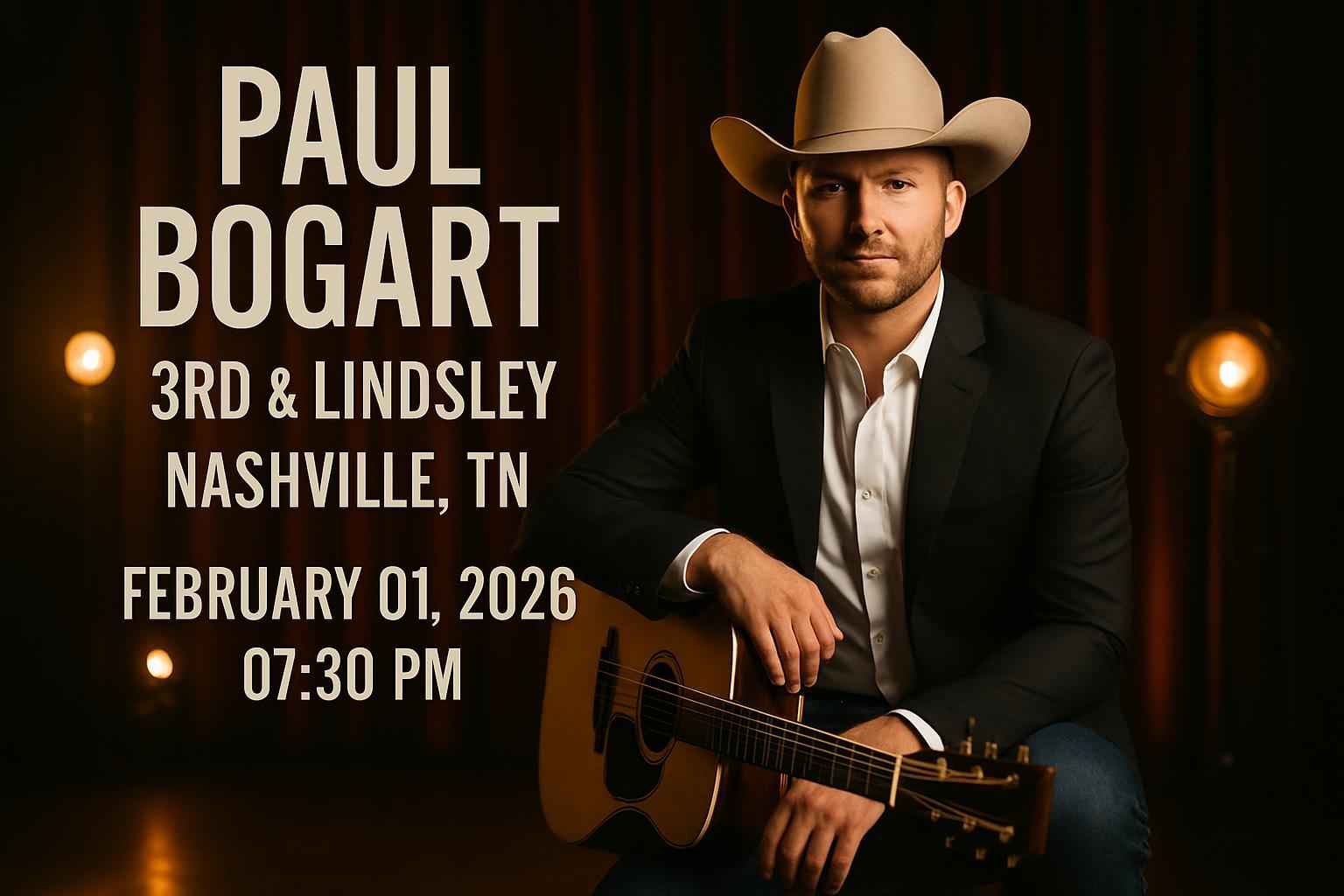 Experience country music live with Paul Bogart at 3rd and Lindsley in Nashville TN on February 01 2026 at 730 PM. Secure exclusive Paul Bogart concert coupon codes from RSVP Event Agency and save instantly on your tickets. This Nashville live music event brings together authentic country sound and a vibrant local crowd for a night to remember. Discover ticket discounts venue details and the latest Paul Bogart setlist info below.