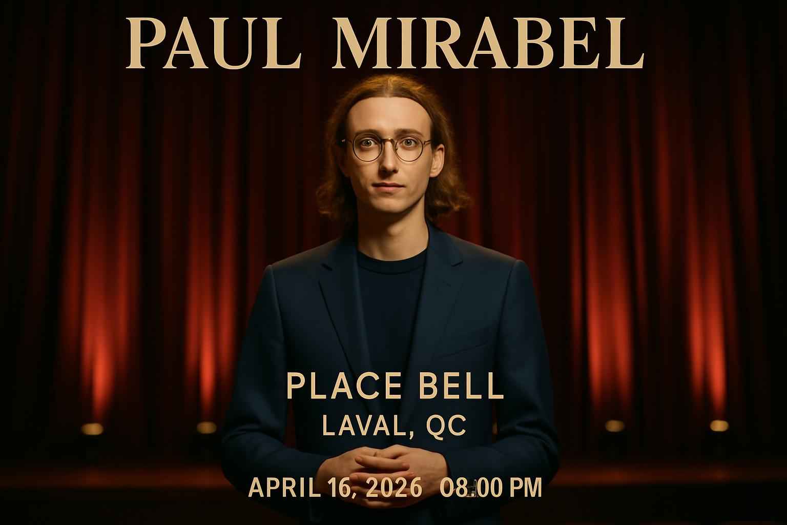 The Paul Mirabel show begins at 8 PM on April 16 2026. Doors open at 7 PM at Place Bell in Laval QC.
