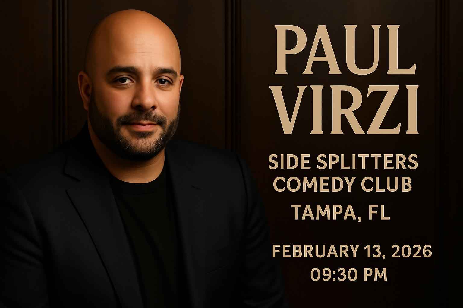 Paul Virzi performs live at Side Splitters Comedy Club in Tampa on February 13, 2026, at 9:30 PM. Known for sharp, relatable humor, his show promises a memorable night. RSVP Event Agency offers exclusive coupon codes and ticket deals with free parking and nearby dining options. Arrive early for best seating; age limit is typically 18+.