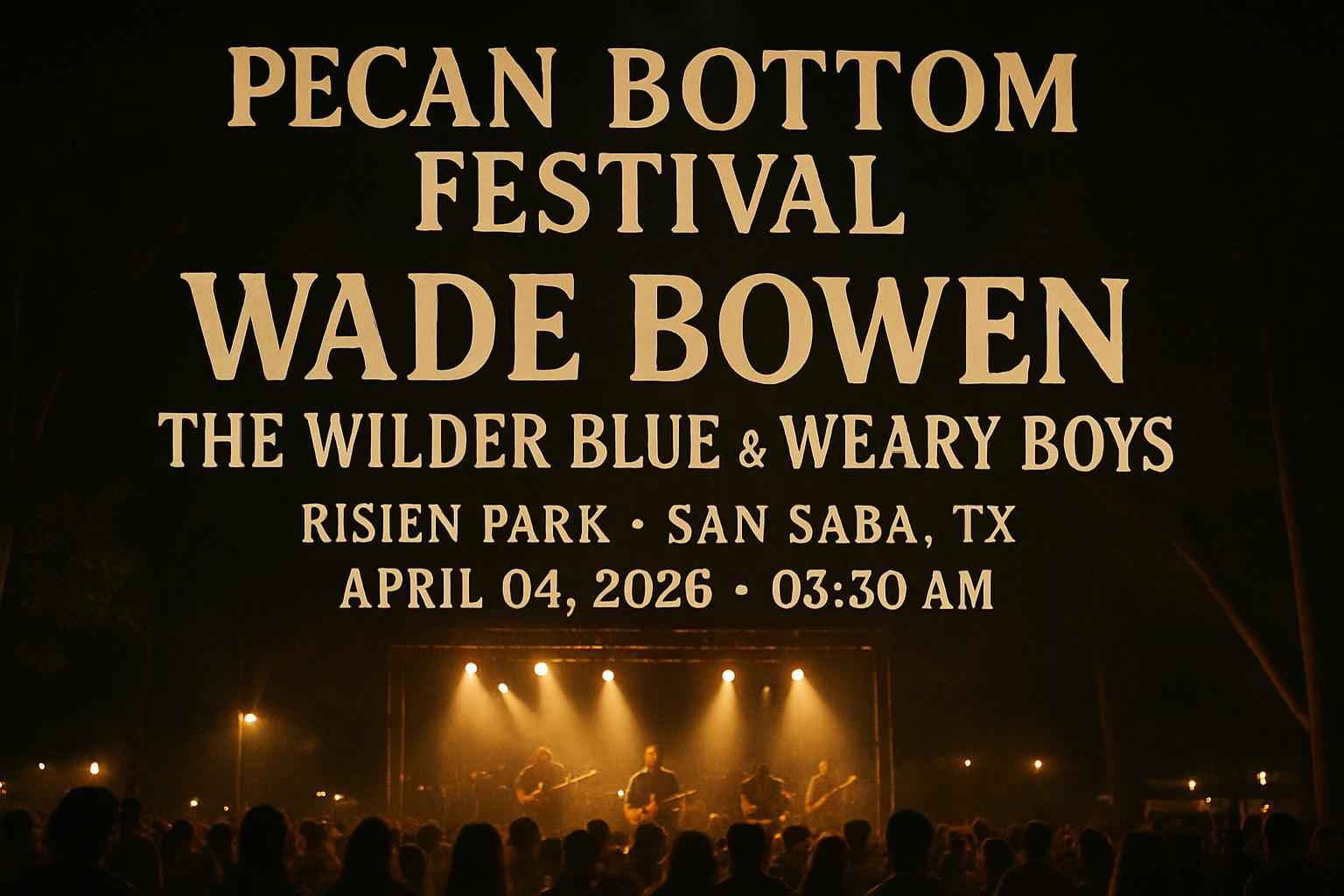 Experience the energy of Texas country music at the Pecan Bottom Festival featuring Wade Bowen, The Wilder Blue, and Weary Boys at Risien Park in San Saba, TX. This highly anticipated event takes place on April 04, 2026 at 03:30 AM and attracts fans from across Central Texas and beyond. Secure exclusive Pecan Bottom Festival coupon codes from RSVP Event Agency to enjoy the best ticket prices and save on your festival experience today.
