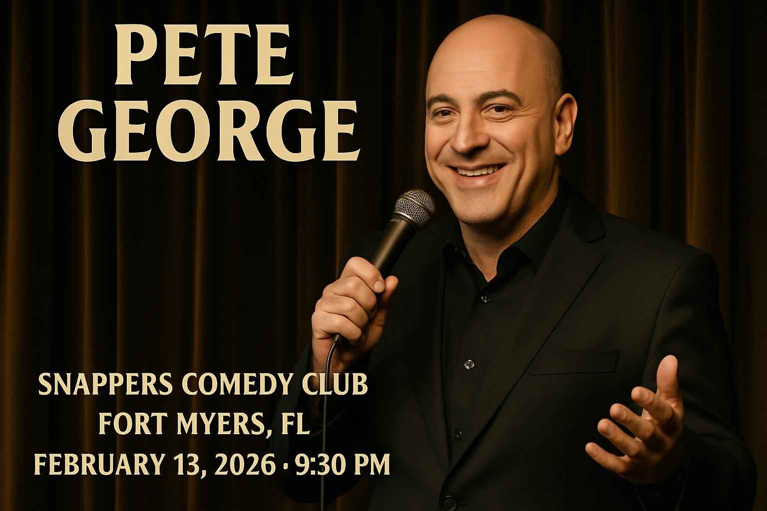 Experience a night of laughter with Pete George at Snappers Comedy Club in Fort Myers FL on February 13 2026 at 9:30 PM. Secure your spot for this top-rated comedy event and discover exclusive Pete George Snappers Comedy Club promo codes from RSVP Event Agency. Enjoy a premium comedy show in Southwest Florida while saving on ticket prices today.