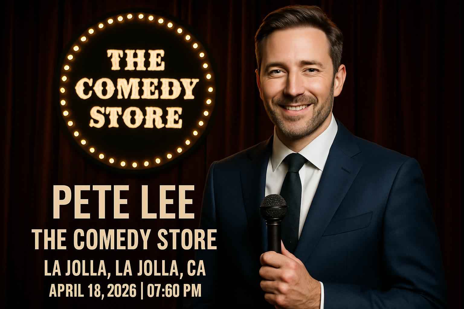 Pete Lee takes the stage at 0930 PM on April 17 2026 at The Comedy Store La Jolla. Doors open at 0830 PM for early seating.