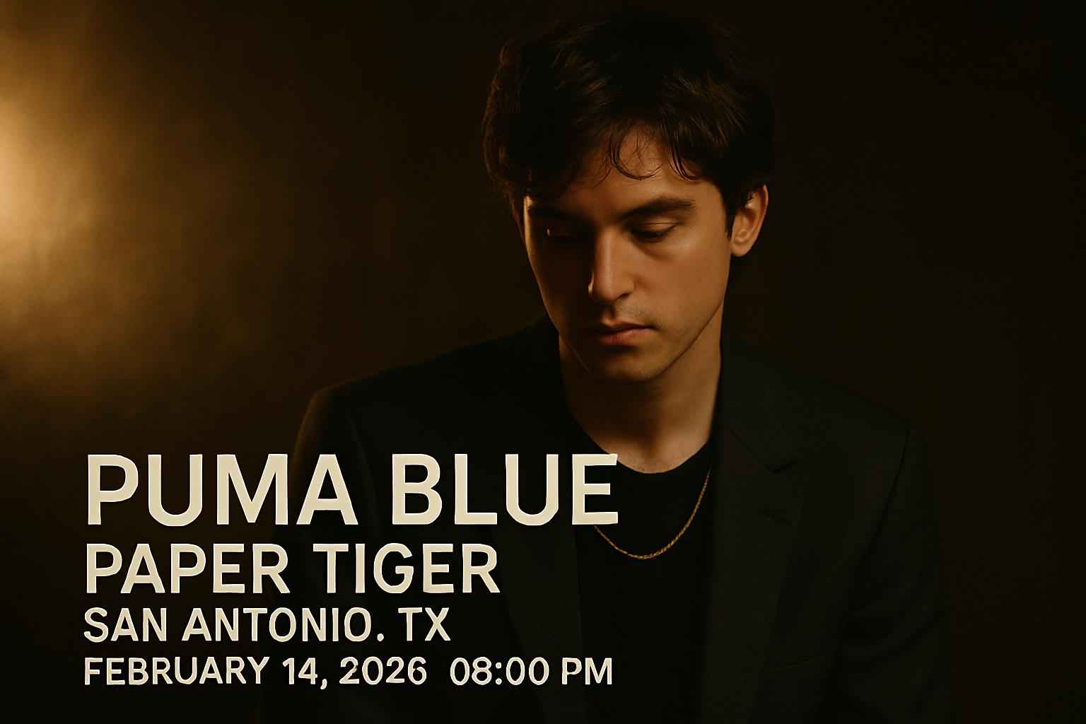 The Puma Blue concert starts at 8 PM at Paper Tiger San Antonio on February 14 2026. Doors open at 7 PM.