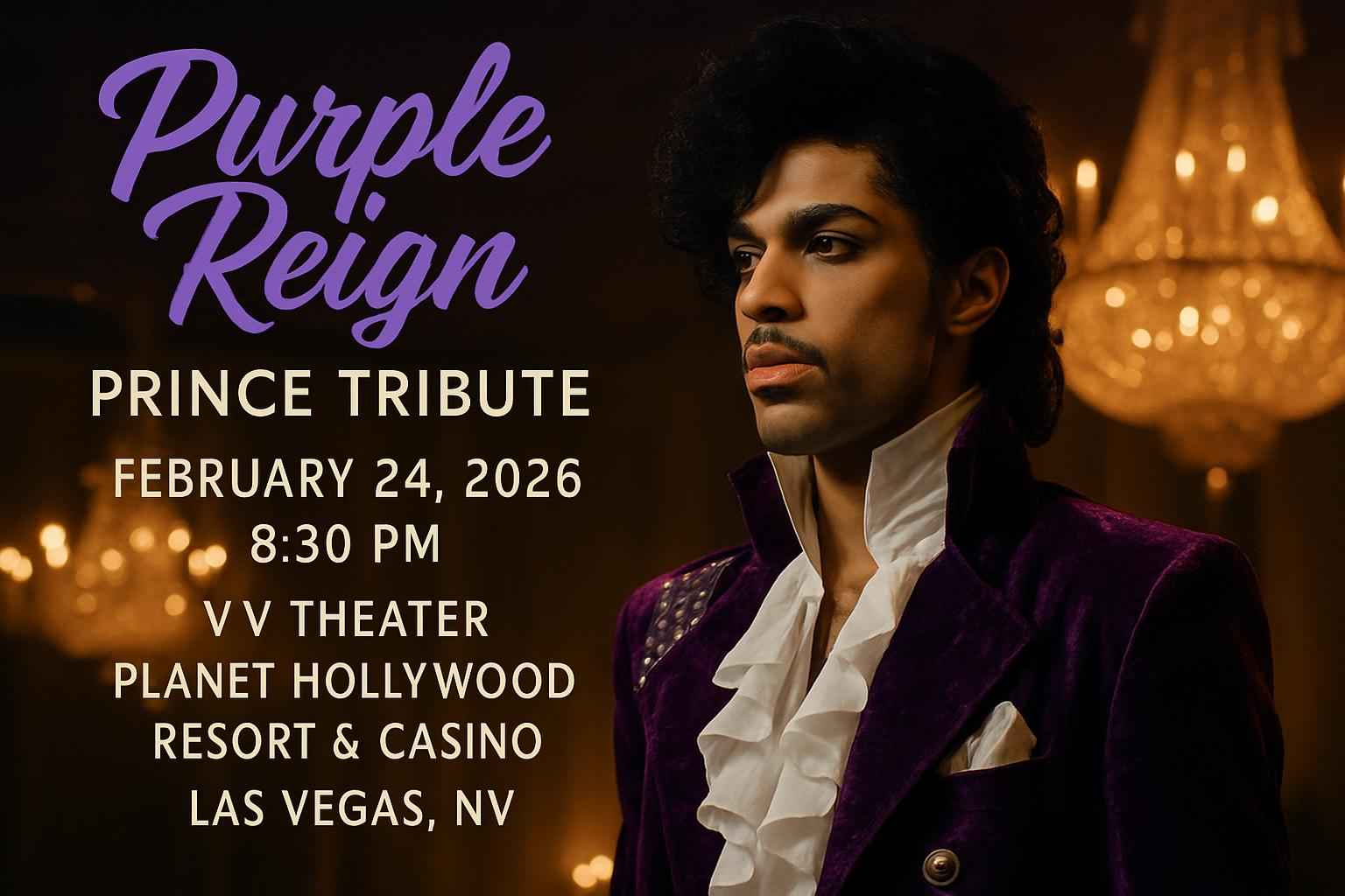 Purple Reign – Prince Tribute takes place on February 24 2026 at 0830 PM at V1 V Theater inside Planet Hollywood Resort and Casino.