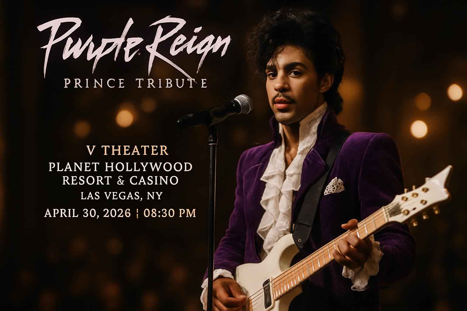 Experience the electrifying Purple Reign – Prince Tribute at V1 V Theater inside Planet Hollywood Resort and Casino in Las Vegas NV on April 30 2026 at 0830 PM. This award-winning Prince tribute show brings the legendary artist’s greatest hits to life with unmatched energy and authenticity. Secure your seat with the best Purple Reign promo codes and coupon deals exclusively from RSVP Event Agency. Enjoy instant savings on tickets and discover why this Las Vegas event is a top-rated entertainment choice for visitors and locals.