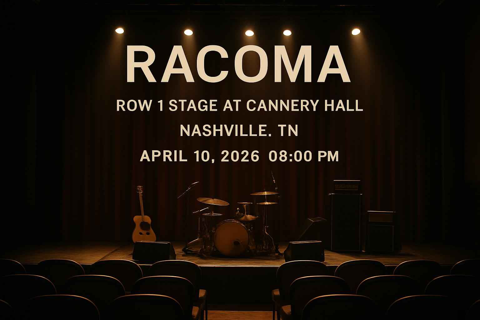 Racoma performs at Row 1 Stage at Cannery Hall in Nashville TN on April 10 2026 starting at 8 PM.