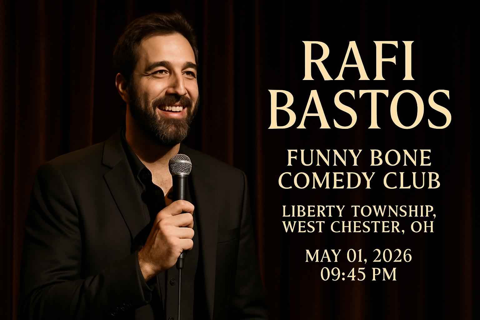 The Rafi Bastos comedy show takes place on May 01 2026 at 0945 PM at Funny Bone Comedy Club in Liberty Township West Chester OH.