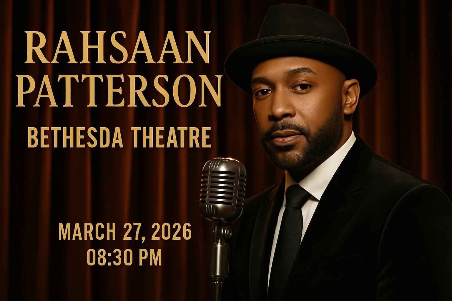 Experience the soulful sound of Rahsaan Patterson live at Bethesda Theatre in Bethesda MD on March 27 2026 at 0830 PM. Secure your seat for a night filled with dynamic vocals and unforgettable R and B melodies. RSVP Event Agency offers exclusive Rahsaan Patterson Bethesda Theatre coupon codes for extra savings on your ticket purchase. Take advantage of verified promo codes to enjoy the best ticket prices in Montgomery County. Find all the latest event info below and elevate your concert night while keeping your budget in check.