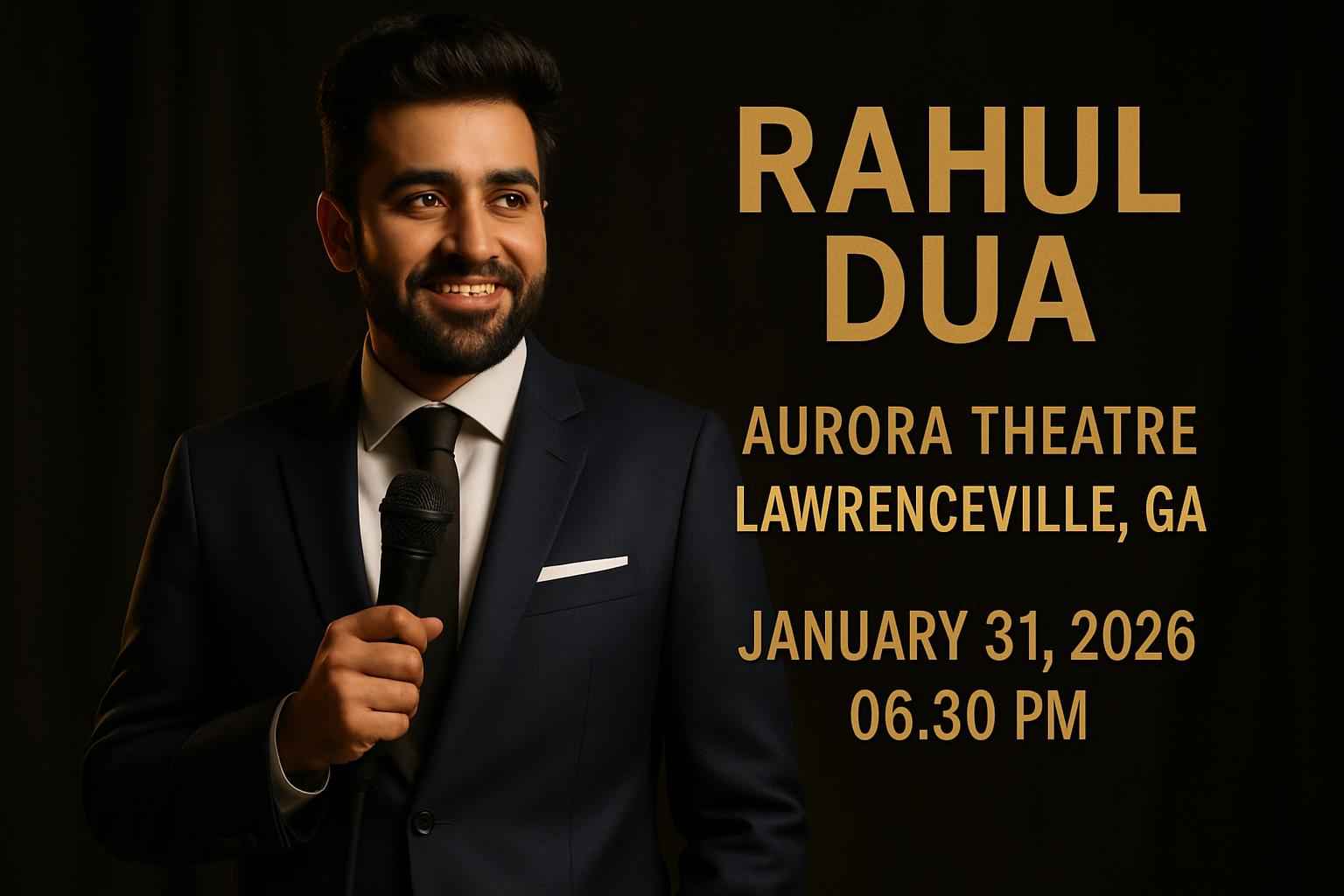 Experience Rahul Dua live at Aurora Theatre, Lawrenceville, GA on January 31, 2026, 6:30 PM. RSVP Event Agency offers exclusive promo codes for discounted tickets and VIP seating. Convenient parking is available nearby. Secure your spot early, enjoy sharp comedy, and save with verified coupons. Ideal for comedy fans across Atlanta and Gwinnett County.