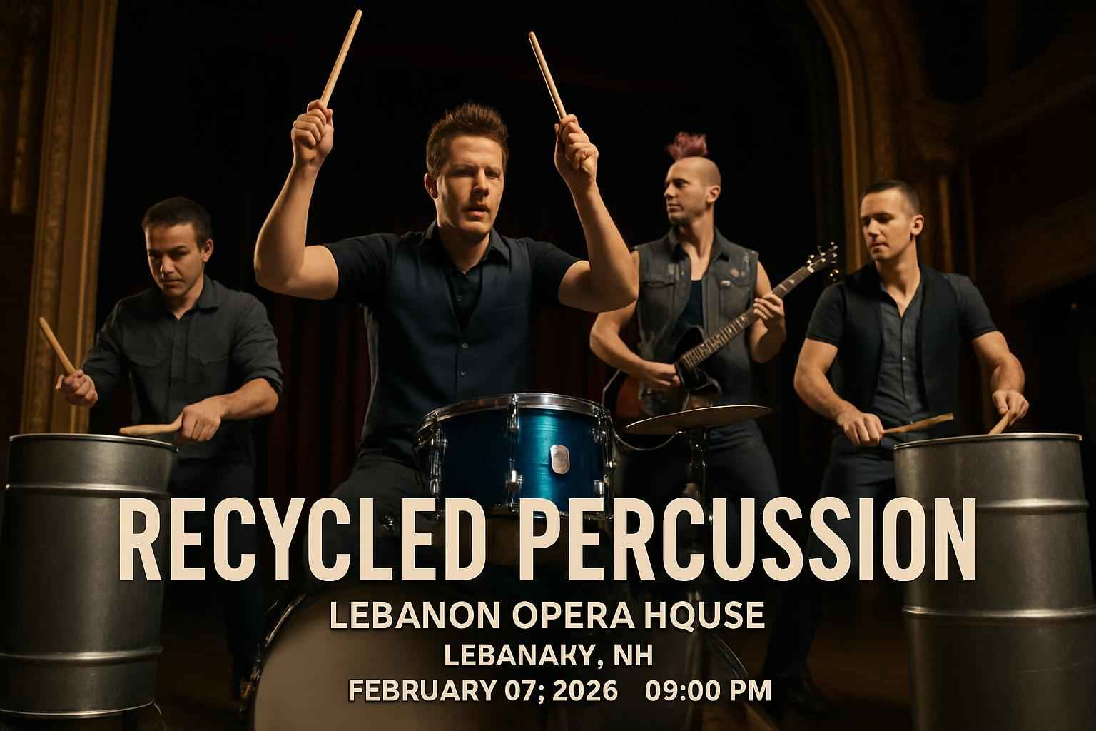 Recycled Percussion brings its signature high-energy performance to the heart of Lebanon NH at the historic Lebanon Opera House. Known for their creative use of everyday objects as instruments this group delivers a unique concert experience with audience participation and unforgettable rhythms. Join hundreds of fans in Grafton County and enjoy a family-friendly show that makes the perfect weekend outing.