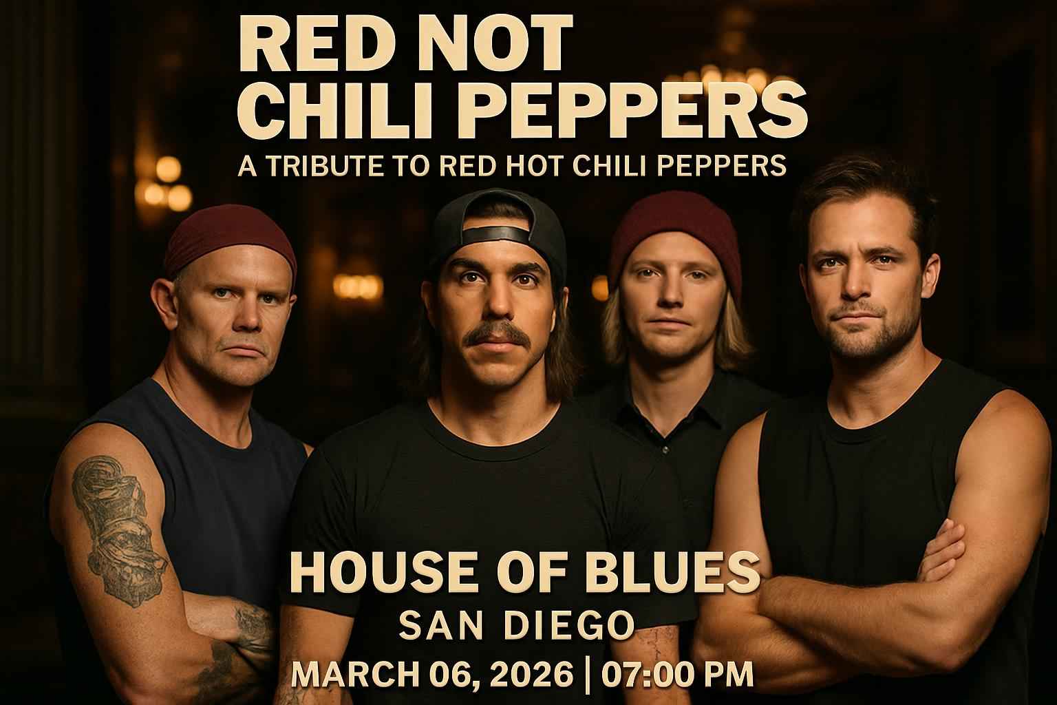 Experience the Red NOT Chili Peppers tribute concert at House Of Blues San Diego on March 6, 2026, 7 PM. Enjoy authentic performances and classic hits with VIP and general admission options. Get exclusive, verified promo codes and discounts from RSVP Event Agency for affordable tickets. Convenient parking and all-ages access make it a must-see live music event.